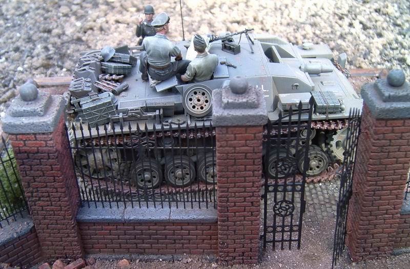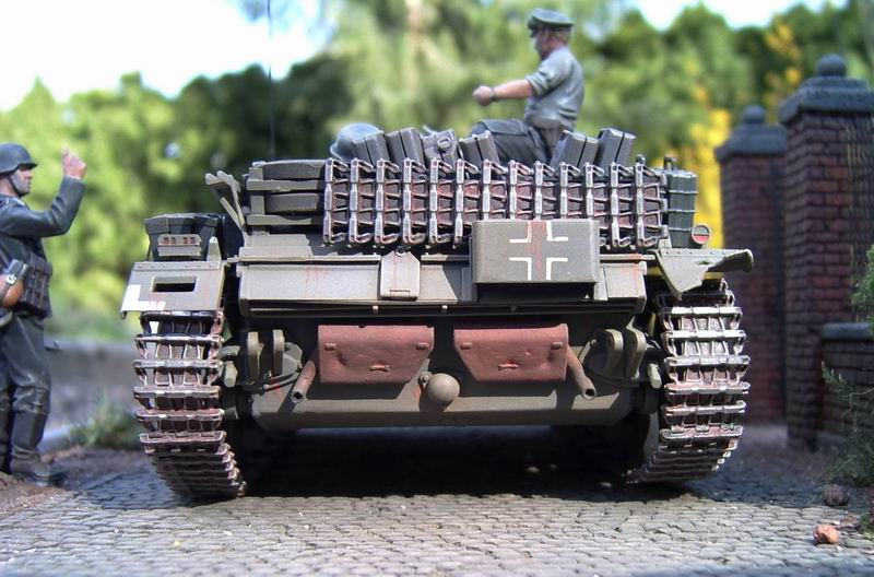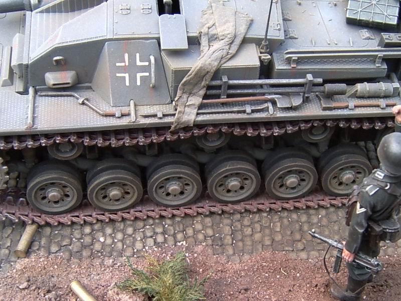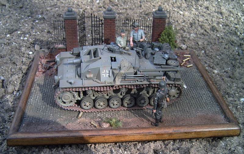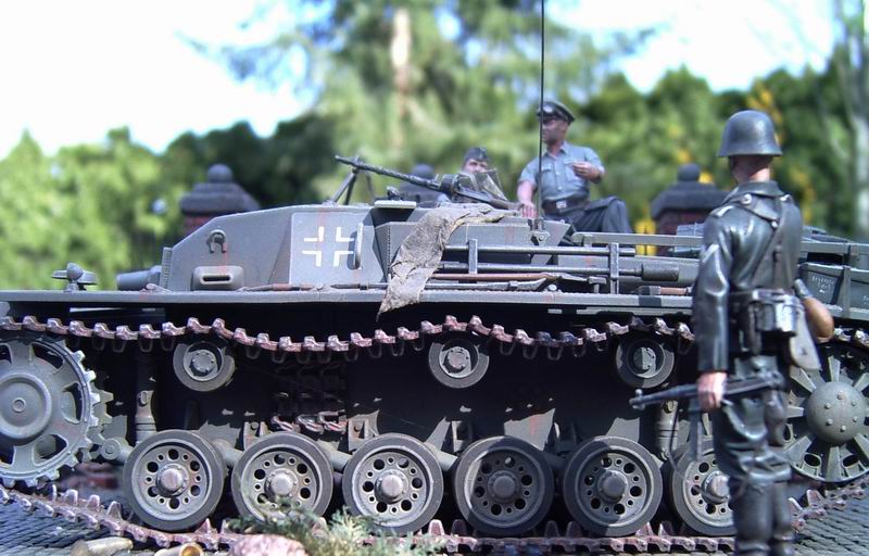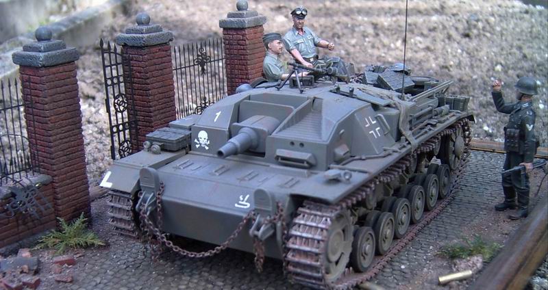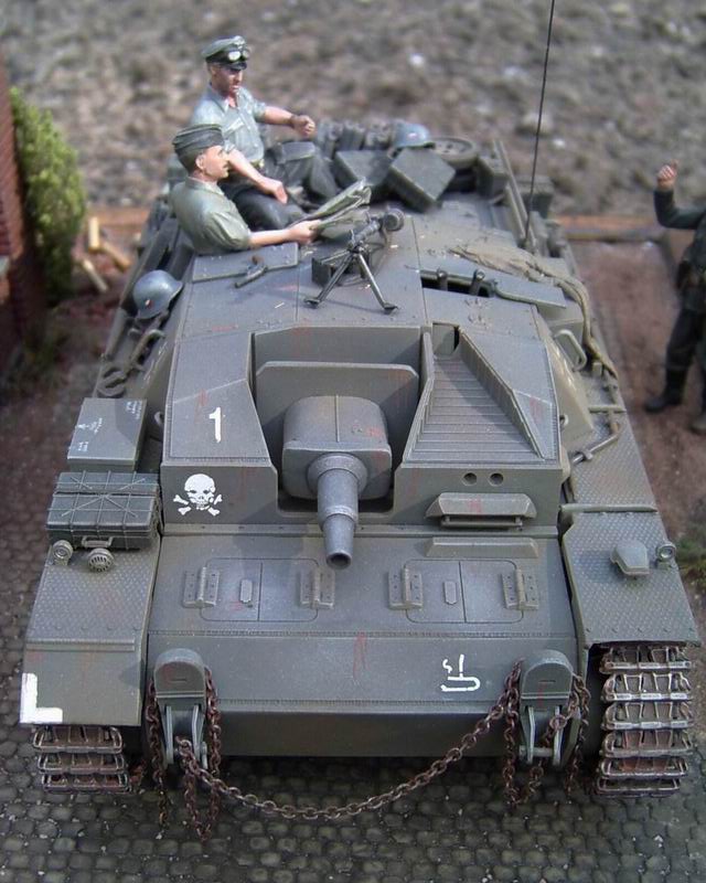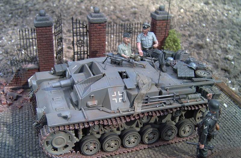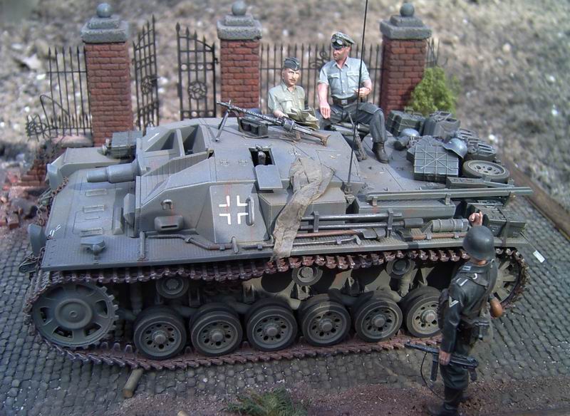 Vorbild: Das Sturmgeschütz III, oder auch einfach nur StuG III genannt, war ursprünglich zur Infanterieunterstützung geplant, wurde aber immer mehr als Panzerabwehrfahrzeug eingesetzt. Der Panzerschutz wurde stetig erhöht, genauso wie die Leistung der Kanone. Das StuG III war ein hervorragendes Panzerabwehrfahrzeug. Es hatte eine sehr niedrige Silhouette, was es für den Gegner schwer machte ein gut getarntes StuG III zu entdecken bzw. es beim Gefecht zu treffen. Der größte Nachteil war aber das es eine fast starre Kanone hatte und so grob ausgerichtet werden musste um ein Ziel zu bekämpfen. Dieser Nachteil fiel aber beim meist defensiven Einsatz kaum auf und bei Straßenkämpfen viel er ganz weg.