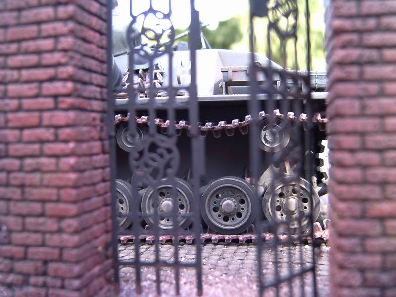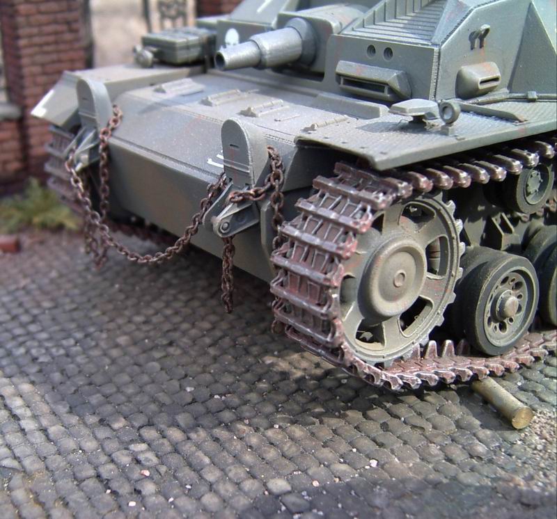 Die Bemalung und die Verwitterung: Das StuG war also recht schnell bereit für die Bemalung. Ich habe vor kurzem angefangen, meine Modelle mit mattem Schwarz oder sehr dunklem Braun zu grundieren. Warum ? Um zu verhindern, daß das helle Plastik der meisten Bausätze an ungewollten Stellen durchschimmert. Ich verpasse meinen Modellen sogar zusätzlich noch einen dunklen Wash, nachdem diese Grundierung aufgespritzt wurde. Der dunkle Untergrund bietet eine gute Basis, um die späteren Farben aufzubauen, wobei man sich von dunklen zu den hellen Schattierungen vorarbeitet. Der dunkle Schimmer verbleibt in den Vertiefungen, während ich die Farbe langsam aufhellen kann, bis zu den Oberflächen, die das meiste Licht einfangen. Die Handhabung der Airbrush ist hierbei ein sehr wichtiger Faktor. Um die Tamiya Farben zu verdünnen, verwende ich Isopropyl Alkohol . Ich bin ein großer Fan der Tamiya Acryl Farben und ich verwende niemals andere Farben für das Airbrushen. Die Tamiya Farbe kann mit dem Isopropyl Alkohol sehr stark verdünnt werden und behält dabei dennoch eine airbrushfreundliche Konsistenz. Hierdurch wird die Farbe ideal für sorgfältige Farbschichten, um die Schattierungen zu variieren. Ich habe sogar die meisten Pastellkreiden weggeworfen und benutze die Airbrush auch für die größten Teile der Verstaubungen!