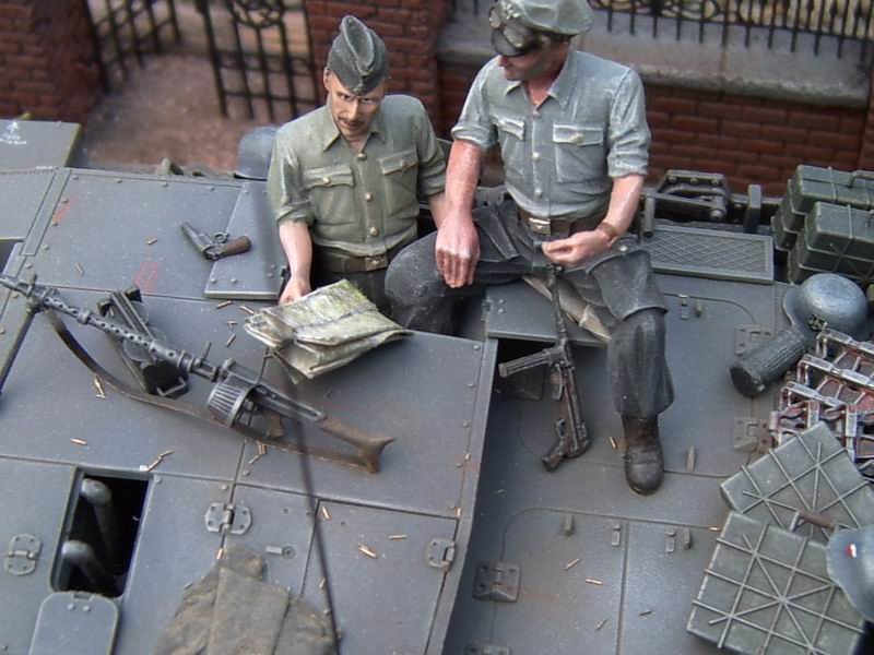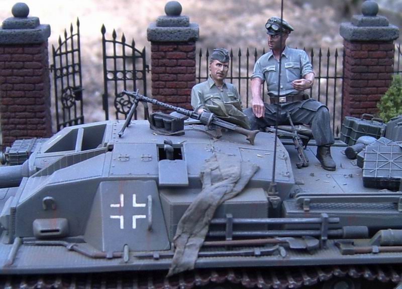 Nachdem der Wash getrocknet war, stand das Trockenmalen auf dem Programm. Schwarze und weiße Ölfarbe wurde aus der Tube auf ein Stück Pappe gedrückt und einen Tag eintrocknen gelassen. Der Karton saugt das Öl der Farbe auf und hinterlässt eine Ölfarbe mit einem größeren Pigmentanteil. Hierdurch ist es besser geeignet für das Trockenmalen. Ferner wird so das leicht ölige Schimmern beim abtrocknen vermieden. Ein recht heller Grauton wurde gemischt und mit einem relativ harten, flachen Pinsel aufgenommen. Dieser wurde nun nahezu vollständig auf einem Taschentuch ausgewischt. Nun wird das Modell mit dem Pinsel bearbeitet, wobei ein leichter Grauton auf den Oberflächen und hervorstehenden Teilen verbleibt. Der Mix wurde auch genutzt, um den ebenen Flächen eine leichte Farbvariation zu verpassen. Dieses ist sehr wichtig, da das Panzergrau ansonsten sehr bieder und langweilig aussehen kann. Das echte Panzergrau scheint in staubigen Umgebungen sehr schnell ausgeblichen zu sein. Ein paar Farbabplatzer wurden aufgebracht, mittels eines feinen Pinsels und Tamiya Matt Schwarz gemischt mit einem Schuss Panzergrau.