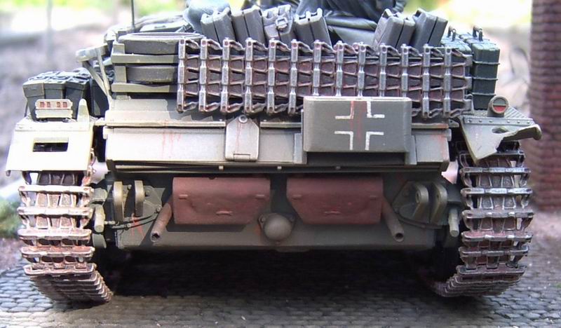 Der Modellbau: Der eigentliche Bau geht recht schnell von der Hand, die Teile fallen quasi von alleine zusammen. Das einzige was etwas sorgfältigeres Kleben benötigt sind die Kettenabdeckungen, da diese u.U. etwas schwer an die Wanne angepasst werden können. Für die Werkzeughalterungen, die Lüftergitter und einige andere kleine fotogeätzte Teile, verwendete ich alte Dragon-Teile aus der Grabbelkiste. Die Ausf. B konnte auch mit den frühen 40cm Ketten angetroffen werden oder mit einer späteren, mit einer Art Loch zur Gewichtsersparnis am Kettenende. Diesmal habe ich nicht die Ketten von "Friul" sondern die Einzelkettenglieder die den Bausatz beilagen, da diese sehr akkurat und und dem Vorbild sehr gut entsprachen.