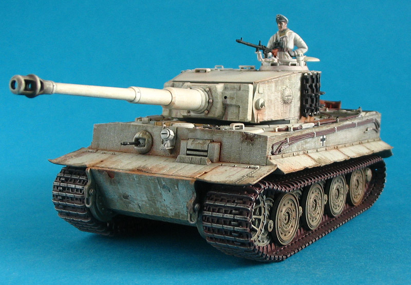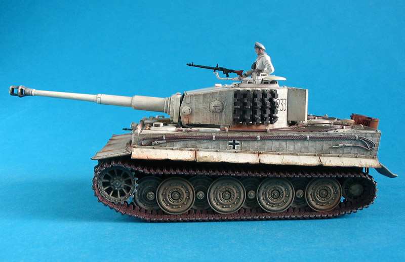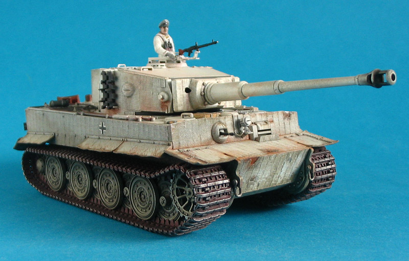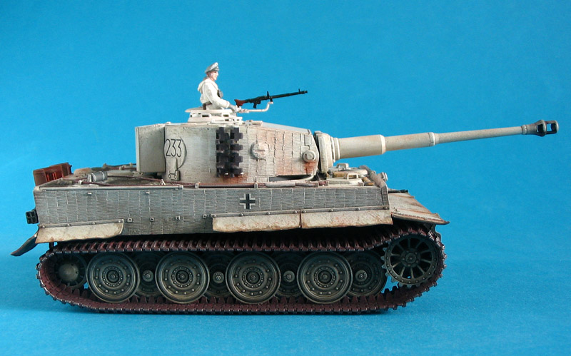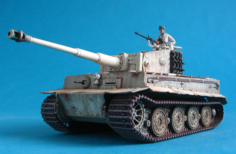 Bei der Bemalung entschied ich mich für eine Version in Wintertarnung der Pz.-Abt. 501, wie sie im Dezember 1944 an der Ostfront eingesetzt war. Der Decalsatz bot insgesamt fünf Fahrzeugmarkierungen verschiedener Kriegsschauplätze, von Frankreich über Italien bis Russland. Um den Panzer abgenutzter erscheinen zu lassen, verbog ich mit einer kleinen Zange die Seitenbleche, trennte eines derselben heraus und fügte die Bolzen der Halterung hinzu. Mit einem Scalpell wurde an der Frontpartie etwas Zimmerit entfernt, um Abpraller feindlicher PaK zu immitieren. Desweiteren verunstaltete ich mit Feile und Bohrer die Abdeckbleche des Auspuffs ... Beulen und Einschüsse!
