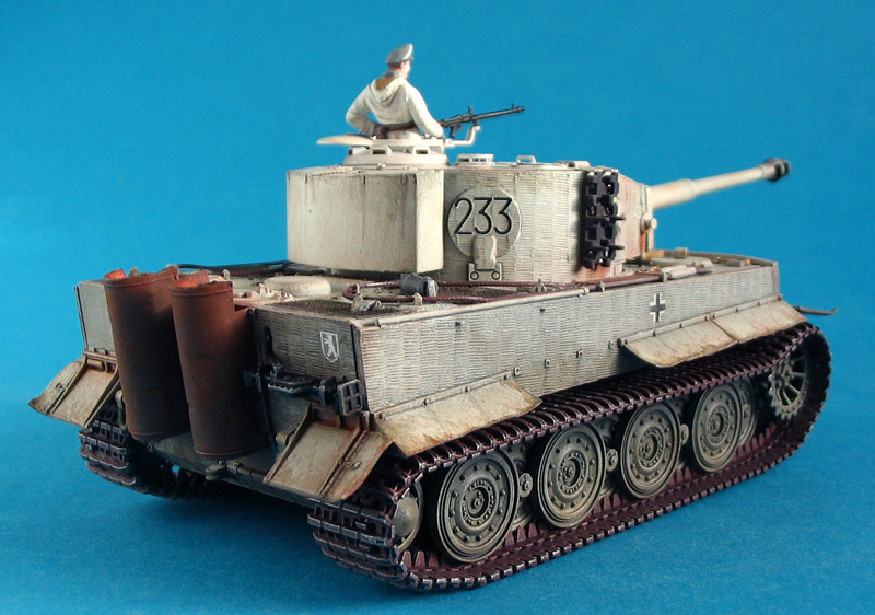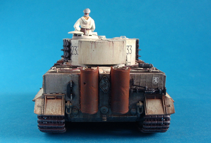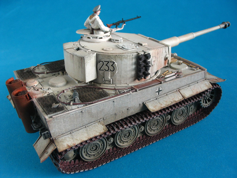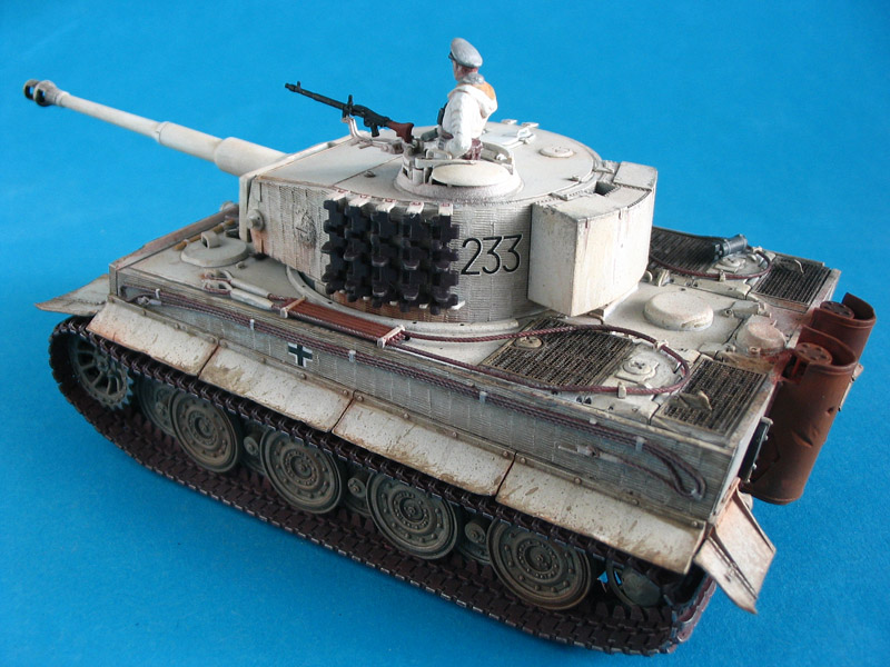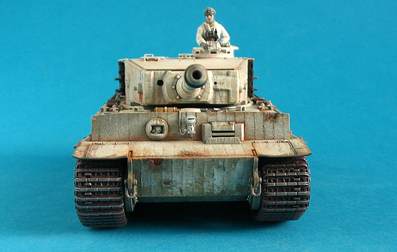 Der ganze Panzer wurde zuerst schwarz(!) grundiert, dann das Fahrwerk abgedeckt und von oben weiss gespritzt. Die Räder bekamen mehrere Durchgänge Washing und Trockenbürsten verpasst, die Kette wurde zuerst mit gebranntem Siena grundiert, dann kam ein Washing mit Schwarz und zuletzt ein Trockenbürsten mit Eisen-metallic von der Firma Revell aus deren neuem Acrylfarben-Set. Der Zimmeritbelag bekam zuerst ein Washing mit Hellgrau und wurde anschließend mit Weiss trocken gemalt. Zuletzt erfolgte die Alterung mit verschiedenen Spritzern von Schlamm und Dreck, Rost und Ruß. Das Ganze teilweise mit Pinsel und Acryl, teilweise mit Pigmenten.