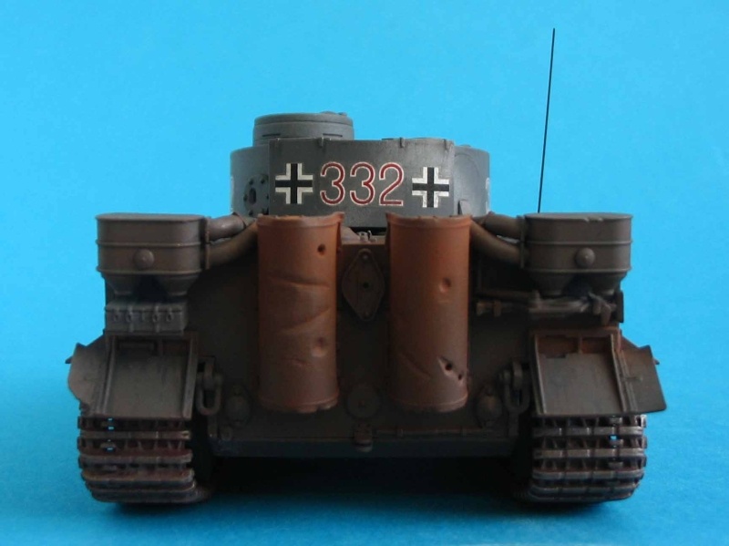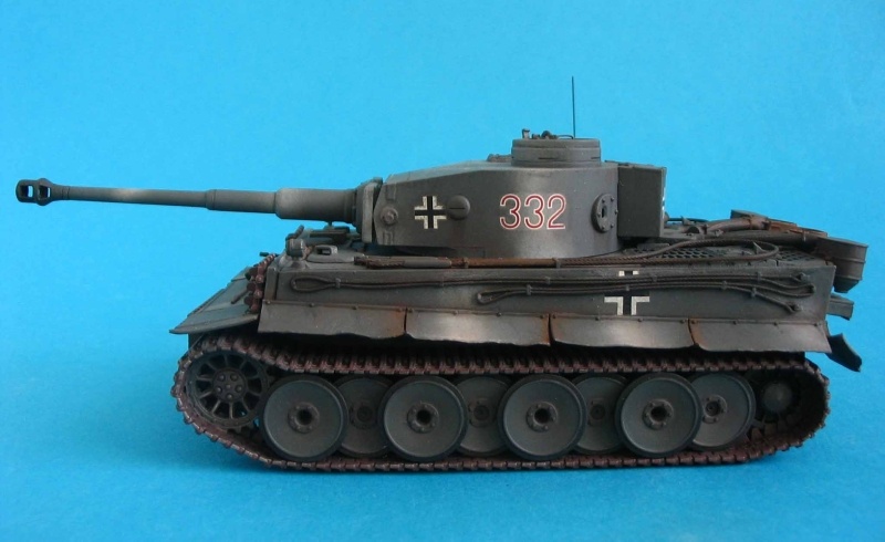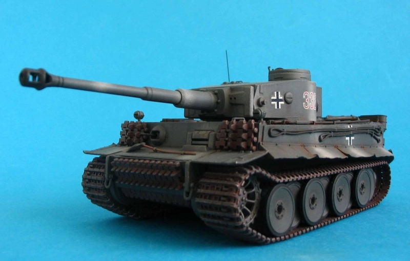 Für die Bemalung wählte ich ein dunkles Grau mit einigen weißen Schlieren, so sah die Tarnung vieler früher Tiger 1942-43 in Rußland aus. Oft wurde über die graue Grundierung behelfsmäßig mit weißer Kalkfarbe ein "Tarnschema" aufgetragen, manchmal nur mit einem Lappen ... das im Frühjahr bei einsetzendem Regen binnen kurzem weggespült war. Laut den Markierungen handelt es sich hier um ein Fahrzeug der sPzAbt 503, die 1943 in Russland eingesetzt war.