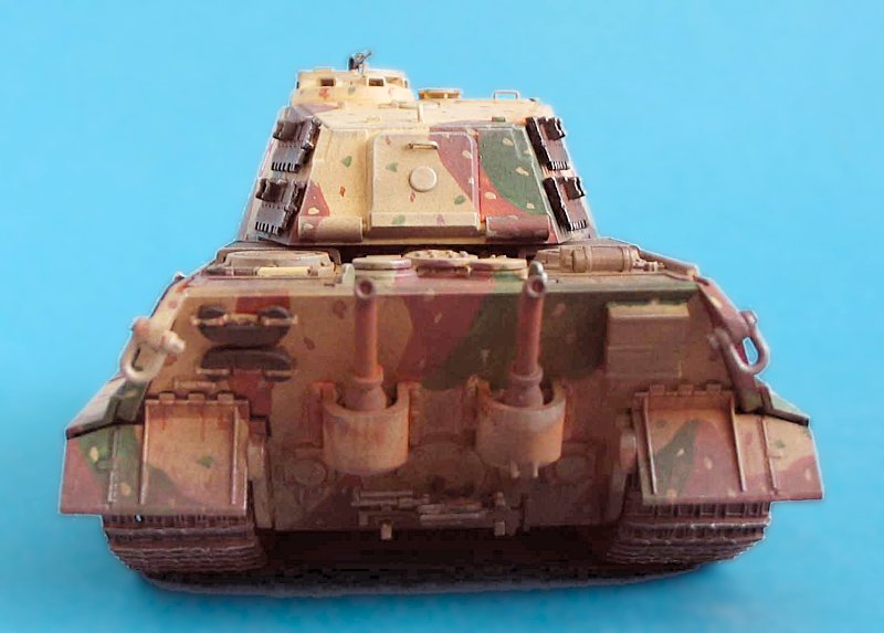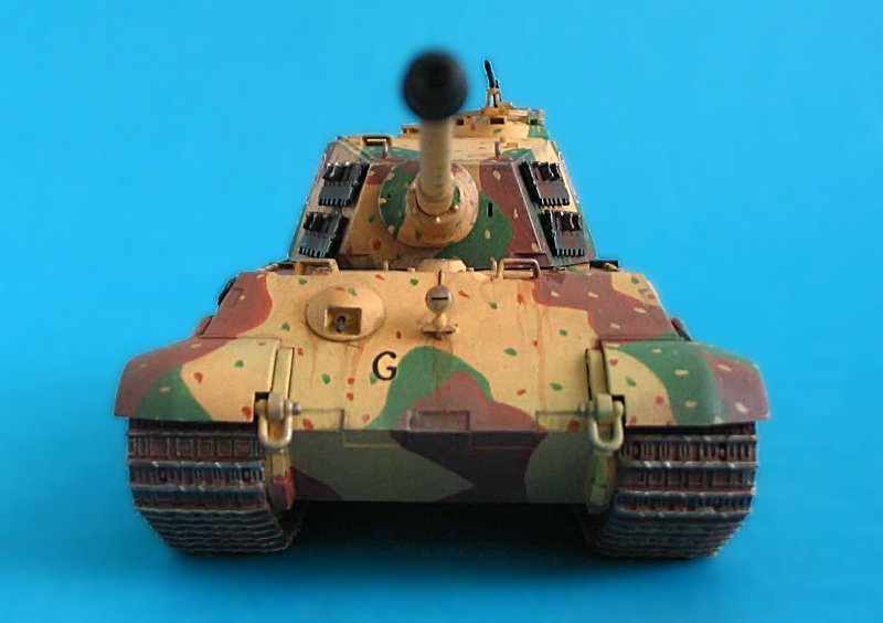 OK, das wollte ich jetzt nicht versuchen und das schöne Modell am Ende noch versauen... und entschied mich deshalb für Version "A" der Bauanleitung, ein Panzer der sPzAbt 501 aus Trois Ponts in Belgien in schön scharfkantigem Dreifarbtarnmuster. Dieses konnte ich, ohne meine Airbrush allzusehr quälen zu müssen, von Hand auftragen. Einzig zum verschmutzen und auftragen von Ruß nutzte ich die Pistole. Das gesamte Modell wurde in mehreren Washings mit stark verdünntem Schwarz und Braun überzogen um die Vertiefungen und Rillen hervorzuheben,alle Kanten wurden mit einem Beige trocken gebrusht.