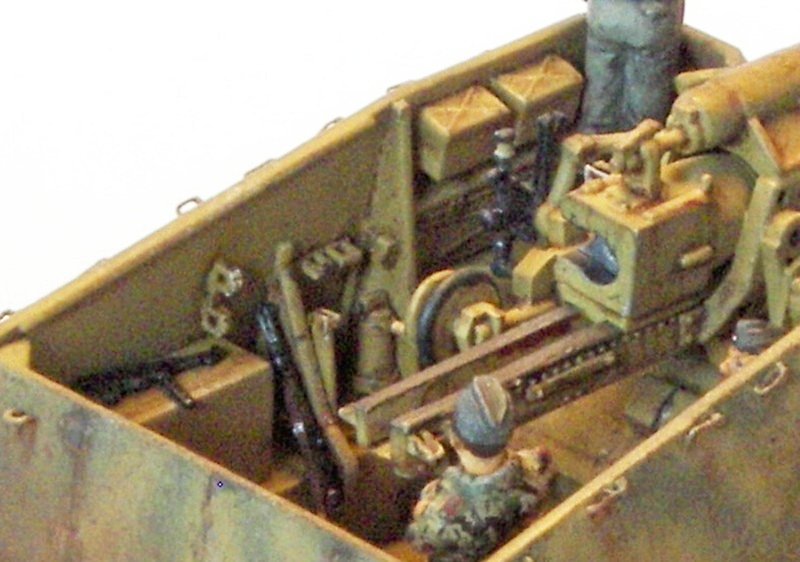 Weiterhin habe ich die Ösen am Kampfraum und diverse Griffe ersetzt, da diese angegossen waren und unmöglich aussahen. Dabei habe ich gleich noch die Befestigung der Plane für die Kampfraumöffnung ergänzt. Hierfür verwendete ich Draht in verschiedenen Stärken. Im Kampfraum fügte ich dann noch die Funkanlage, den Feuerlöscher, Winkelbleche und die MG-Halterung hinzu (,welche im Bausatz merkwürdigerweise ausgegraut ist). Die Peilstangen, die nach dem Lackieren erst angebaut wurden, erhielten ebenfalls noch neue Halterungen, da die Revell-Teile in Form von Quadern falsch widergegeben sind. Sektkorkenfolie, zu kleinen Leisten zurechtgeschnitten, half hierbei aus.