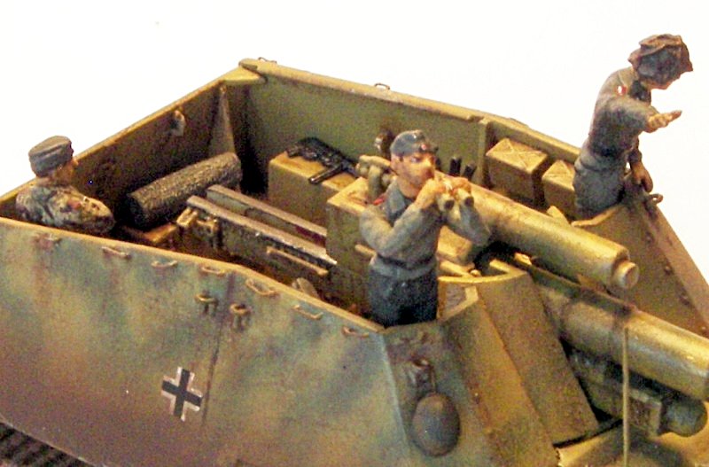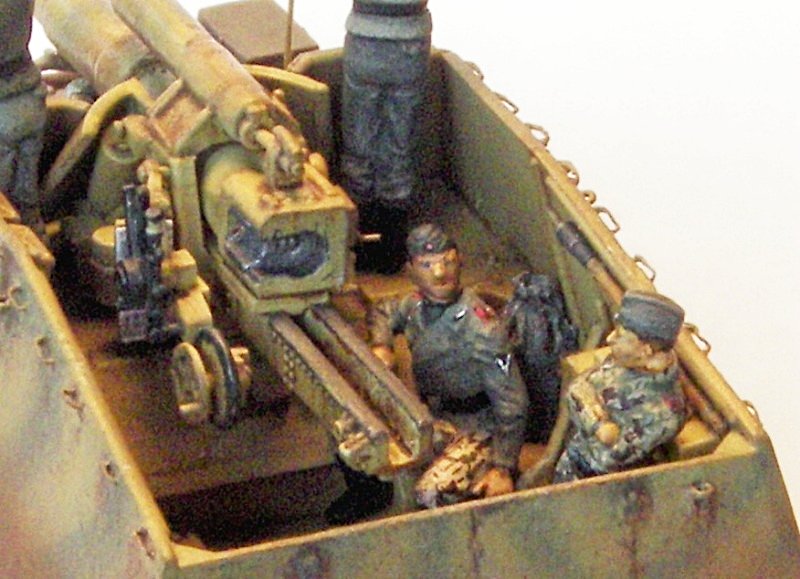 Diese bestanden aus einigen Washings mit Ölfarben, einem dezenten Drybrushing mit Testors ANA 616, sowie einigen Kratzern und Farbabplatzern, welche ich mittels eines Graphitstiftes und wieder mit der Farbe ANA 616 erzeugte. Zuletzt wurde das Modell mit verschiedenfarbigen Pigmenten eingestaubt und auf einer kleinen Base platziert.