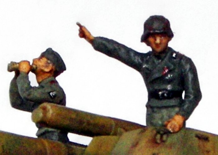 Zusätzlich kamen noch Preiserfiguren, ein Benzinkanister und ein selbstgefertigtes Tarnnetz dazu. Die Base entstand ebenfalls im Eigenbau aus einem Holzbrettchen, welcher mit Gips und feinem Sand behandelt wurde. Anschließend wurde er lackiert und mit kleinen Pflanzen aus Moos & Statikgras beklebt. Zum Schluss wurde alles noch mal mit Pigmenten verstaubt.