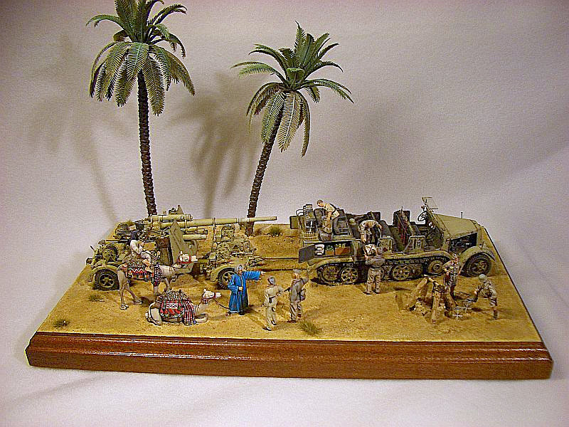 Das Diorama besteht dann aus einem selbst gebauten Brunnen aus kleinen Steinen und Zweigen, einigen gummiartigen Palmen, den Hersteller weiß ich nicht mehr, die ich überarbeitet habe und den Figuren. Letztere modellierte ich zum Teil neu, damit die geforderten Körperhaltungen passten. Die Kamele sind von Red Zebra und von toller Qualität. Die Bemalung der Kamele hat allerdings etwas Zeit verschlungen und ich habe mir noch nie so viele Bilder dieser Tiere im Internet ansehen müssen.