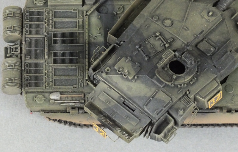 Ein Problem stellen die Decals dar, perfekt gedruckt aber für die britischen SFOR Panzer in der falschen Farbe, da ich in der Restekiste nichts Passendes hatte, habe ich nach einem dunklen Washing und Trockenmalen des gesamten Modells, die Seitenschürzen stark mit einer „Schlammschicht“ in U.S.A.F Tan versehen. Ich hoffe, dass mein Modell trotzdem gefällt.