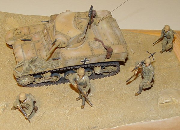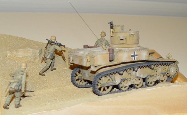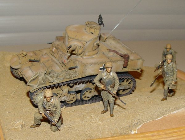 Der US Light Tank M3 Stuart stammt von Tamiya und wurde erheblich nachdetailliert. Die Figuren stammen von Dragon und wurden ebenfalls sehr stark verfeinert. Ihre Köpfe sind von Warrios.