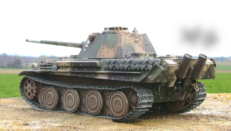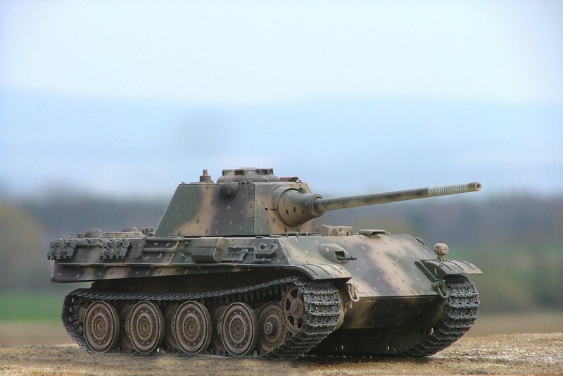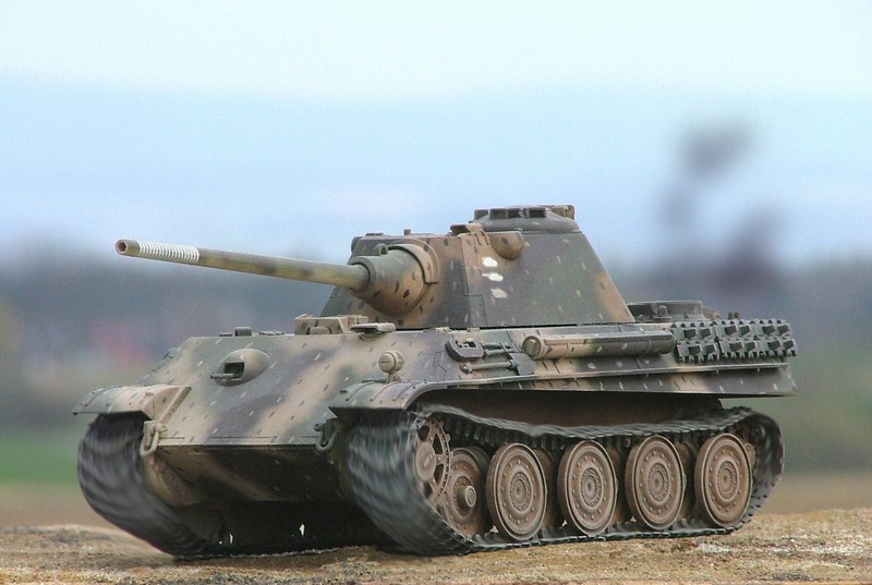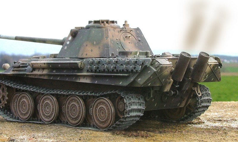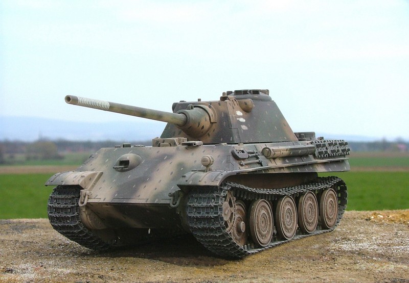Der Panther Ausf. F wurde in der Dreifarbtarnung lackiert. Zuerst das gesamt Fahrzeug in Dunkelgelb bemalen ist diese Farbschicht getrocknet wird mit der Spritzpistole Olivgrün und Braun als Tarnmuster aufgebracht. Alle Farben wurden mit ca. 20% Weiß aufgehellt. Ist alles trocken erfolgt eine leichte Verschmutzung des Panzers mit stark verdünntem dunklem Braun. Diese verdünnte Farbe legt sich in alle Vertiefungen und um jede Niete am Modell. Auch hier ist eine gründliche Trocknung anzuraten.