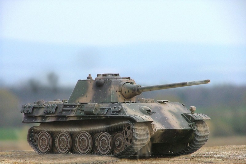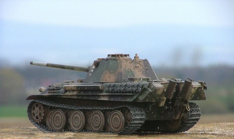 Vorbild: Bei Daimler liefen schon Ende 1944 die Vorbereitungen zur Auslieferung des Panzerkampfwagen Panther, Ausführung F oder dem Sd.Kfz. 171, auf vollen Touren. Dieses Ausführung des "Panther" wurde unter Zusammenarbeit von Mercedes-Benz und Skoda entwickelt. Die Vorgaben zu diesem Fahrzeug wurden vom Heereswaffenamt erlassen. So wurden folgende Baurichtlinien erlassen: geänderte Ausführung der Turmblende, eine Erhöhung des Panzerschutzes ohne eine Gewichtserhöhung des Turmes. Verringerung der Turmauftreffläche ohne den Turminnenraum zu verringern, dem Einbau eines stereoskopischen Entfernungsmessers. Dieser optische Entfernungsmesser galten als revolutionär. Außerdem sollte eine Verringerung der Produktionskosten erreicht werden. Und es sollte eine Infrarot-Ausrüstung durch schnelle Umrüstung erfolgen können.