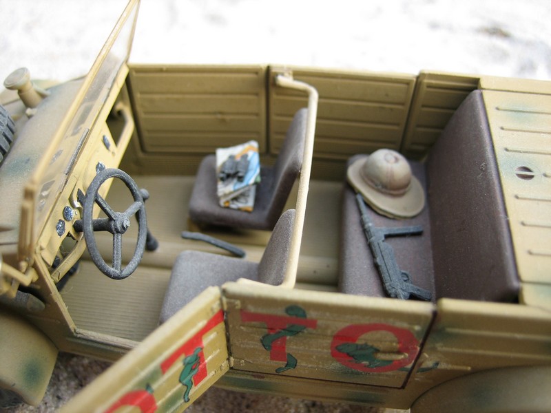 Wahlweise kann das Verdeck geschlossen oder geöffnet dargestellt werden. Nicht zu vergessen das dem Bausatz noch zwei Figuren, ein Zelt, sowie ein Funkgerät beiliegt. Eine der Figuren sieht dem "Wüstenfuchs" Erwin Rommel sehr ähnlich. Der andere Soldat sitzt gerade vorm Zelt und gibt über Funk die neusten Meldungen durch.