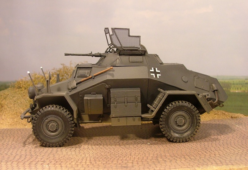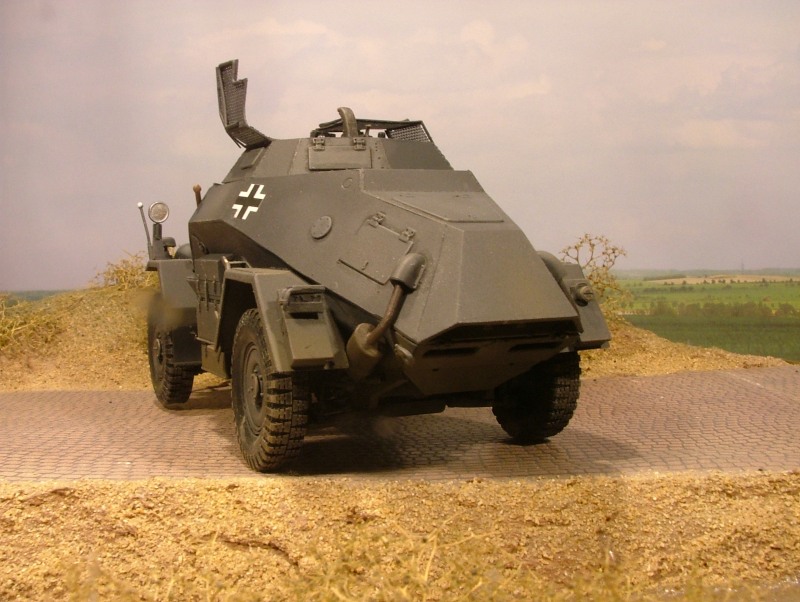Vorbild: Dieser leichte Spähpanzer war ein Fahrzeug aus einer ganzen Serie von Vierrad-Panzerfahrzeugen, die auf dem Fahrgestell des schweren Personenkraftwagens entwickelt wurden. Es gab fünf Modelle. Das Sd. Kfz.221 wurde Nachfolger des Panzerwagen Kfz. 13 von 1936 an die motorisierten Aufklärungseinheiten geliefert. Es war ein Kampfwagen mit oben offenem siebeneckigen Zweimannturm. Die Bewaffnung bestand nur aus einem 7,92-mm-MG. Das 1938 eingeführte Sd.Kfz.222 war der Standardkampfwagen für die Aufklärungseinheiten auf Divisionsebene. Es wurde in erheblich höheren Stückzahlen gebaut als sein Vorgänger. Es hatte einen oben offenen 10eckigen Zweimannturm, in dem eine 20-mm-Kanone mit 220 Schuß und ein 7,92-mm-MG mit 2000 Schuss untergebracht waren. Das Sd.Kfz. 223, das 1938 eingeführt wurde, war der Funkwagen des Sd.Kfz.222. Er hatte eine weitreichende Funkausrüstung und glich dem Sd.Kfz.222, mit der Ausnahme des kleineren neuneckigen Turms mit nur einem 7,92-mm-MG. Außerdem hatte er eine Rahmenantenne rund um die Wanne. Das Sd.Kfz. 260 war ein schwach gepanzerter Funkwagen für die Stäbe, von dessen Funkgeräten eine große Reichweite verlangt wurde. Er glich dem Sd.Kfz.223, nur war der Turm weiter nach hinten versetzt, um Platz für die großen Funkgeräte zu schaffen. Er war nur selten bewaffnet. Das Sd.Kfz. 261 glich äußerlich dem Sd. Kfz 260, nur hatten die ersten Modelle eine klappbare Rahmenantenne. Das Sd. Kfz.222 war ursprünglich auf dem Standardfahrgestell Modell A aufgebaut, benutzt wurde jedoch nach 1938 das Fahrgestell Modell B. Die Hauptvorteile waren ein stärkerer Motor mit 81 statt 75 PS und wesentlich bessere Bremsen, hydraulisch statt mechanisch. Das Sd.Kfz.222 bewährte sich in Nordafrika und in Westeuropa und blieb bis zum Ende des Zweiten Weltkrieges im Einsatz. In Russland jedoch erwies es sich als nur begrenzt einsatzfähig. Es wurde deshalb durch das Halbkettenfahrzeug Sd.Kfz 250/9 ersetzt, das den gleichen Turm hatte.