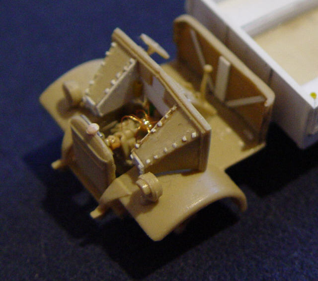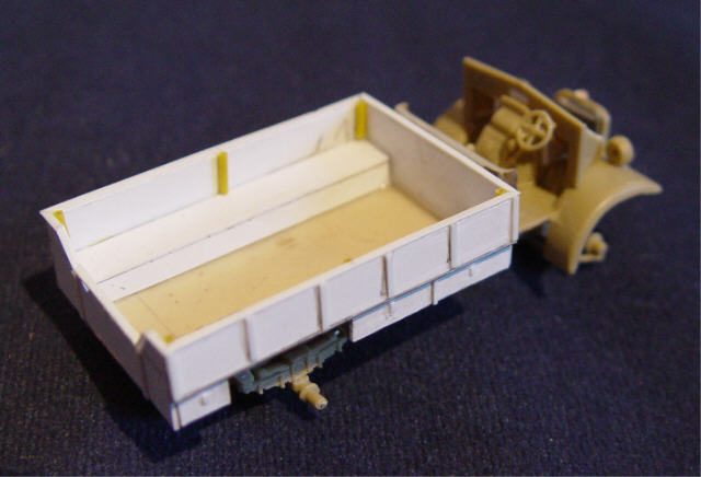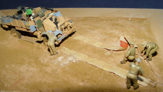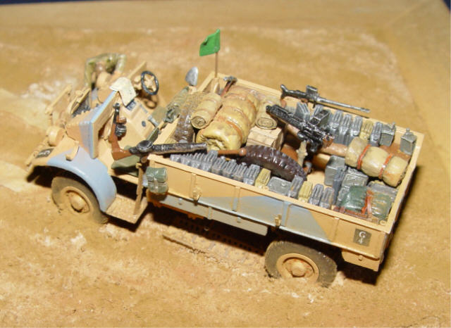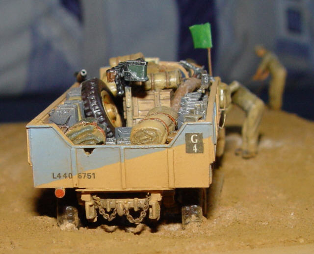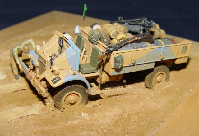 Das ist ein Ford F-30gs, der von der L.R.D.G. vor allem 1941 verwendet wurde. Der Nachfolger Chevrolet 1533 30cwt ist ja weitaus bekannter. Die vorderen Teile des Modells sind vom ESCI-QUAD, der Motorraum wurde extra detailliert, die Pritsche habe ich nach den errechneten Maßen selbst aufgebaut, die Räder sind vom HASEGAWA-Daimler und die Hauptteile der Figuren überwiegend von CMK, nur mit anderen Köpfen versehen.