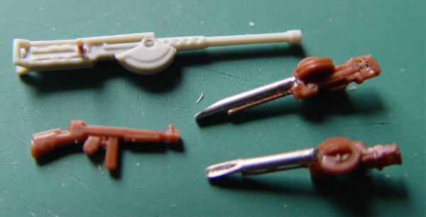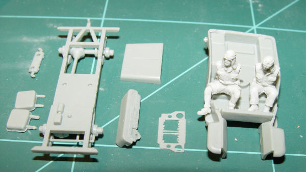 Das sehr dicke Frontteil mit den angedeuteten Kühlerrippen habe ich abgeschliffen, die überflüssigen Rippen herausgebrochen (wie im Original) und mit feinem Maschendraht hinterlegt. Der Sonnenkompass auf dem Armaturenbrett ist mein "Lieblings-Detail", die Läufe der Vickers KO Zwillings-MGs von MATCHBOX sind Spritzenkanülen. Die sehr plastischen und überzeugenden Figuren stammen von MILICAST.