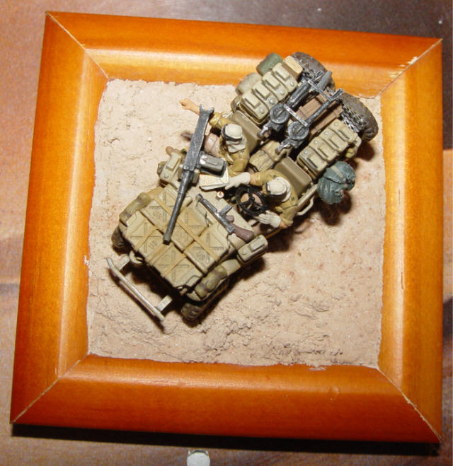 Wenn man jedoch einen PKW in 1:72 einigermaßen überzeugend darstellen will, muss man sich doch mehr Zeit nehmen, als man glaubt. Allein die Recherche hat mich Wochen gekostet. In den Jahren 1940 bis 43 wurden in Art und Anzahl total verschiedene Fahrzeuge und Waffen verwendet. Ich habe vor, für die Jahre 1940 bis 43 je ein L.R.D.G./SAS Diorama zu gestalten. (1941: Ford F30, 1943: SAS Jeep) Zwei muss ich noch bauen - ihr werdet es sicher erfahren.