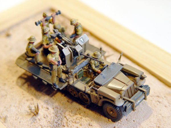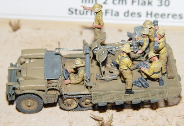 Szene: die komplette Flak-Bedienung befindet sich auf dem Fahrzeug, der Geschützführer gibt dem Fahrer Anweisungen zur Zielrichtung und zum Tempo der Angriffsfahrt, die Mannschaft ist feuerbereit, das Entfernungsmessgerät 1m R 36 ist eingelegt, Reserve-Munition liegt bereit, der Sd.Ah. 51 wurde abgekoppelt, um bei schneller Fahrt besser voran zu kommen