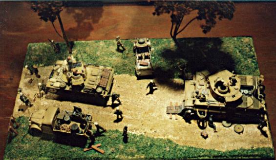 Ein früher Tiger E hat Kettenschaden durch Minen, Instandsetzungsstaffel ist schon vor Ort, ein Panzer III/N sichert, Pioniere räumen weitere Minen fort (siehe gelbe Fähnchen)
