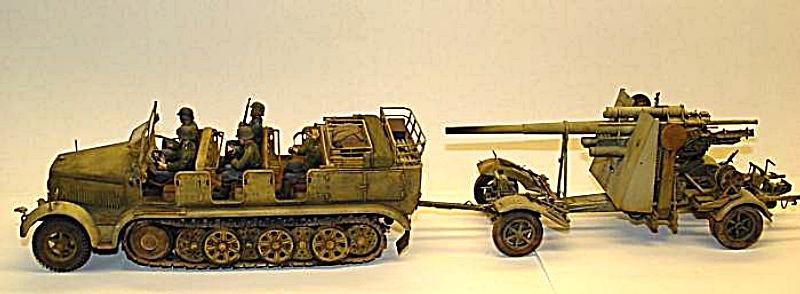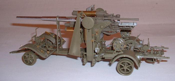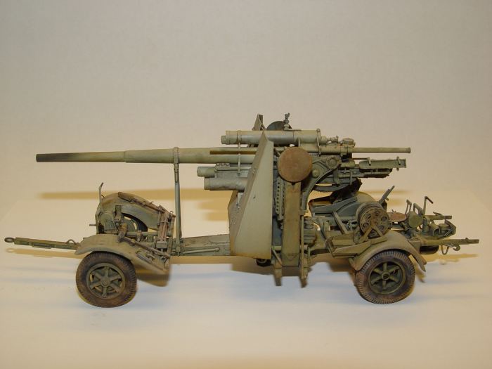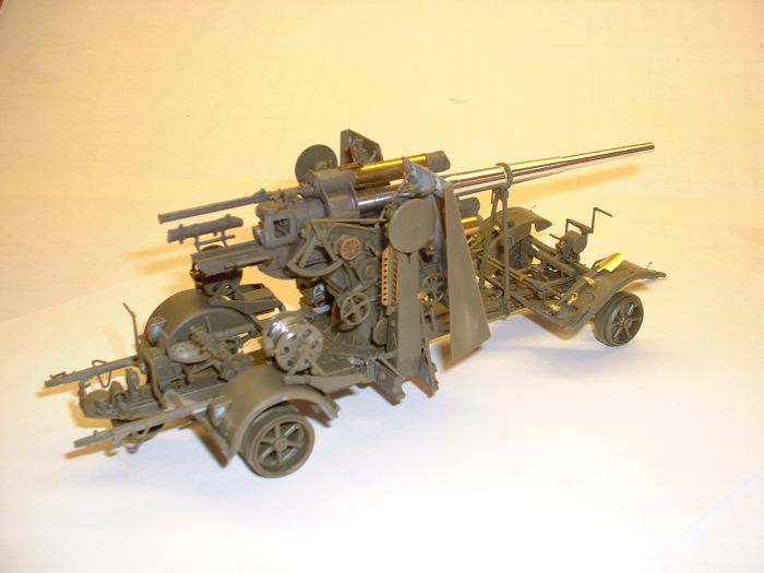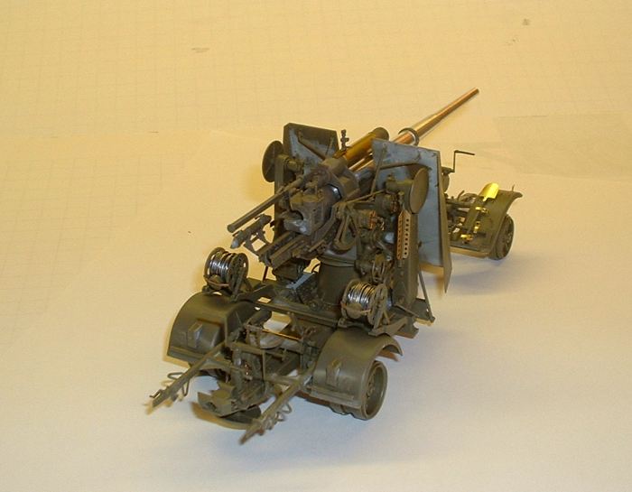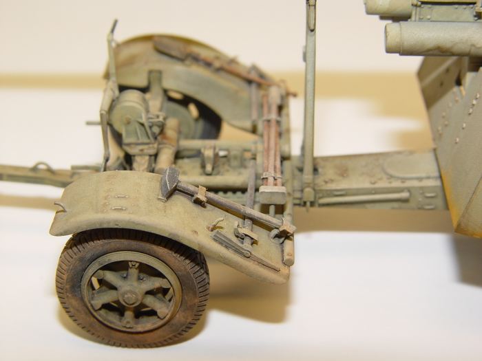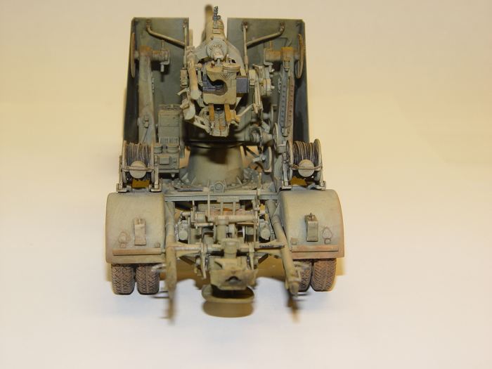 Bemalung: Ich benutzte TAMIYA-Farben. Zuerst wurde das Modell mit Grau (XF63) grundiert. Dann spritzte ich die gelbe Farbe (XF60). Nun erfolgte ein wenig Aufhellen der gelben Farbe (Highlighten). Es folgte ein kurzes Washing mit schwarzer, stark verdünnter Ölfarbe. Nach diesem Arbeitsgang erfolgten das Detailwashing mit Umbra und dann das Trockenmalen mit Ölfarbe. Abschließend noch das Modell mit Pastellkreide der Firma Schminke "verstauben". Rost wurde an einigen Kanten angebracht. Dazu verwendete ich "echten Rost" -korrodierte Metallspäne von einer Flächenschleifmaschine(erhältlich via info@ipmsdeutschland.de)