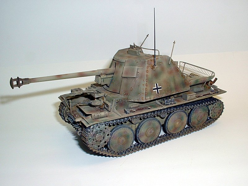 Bemalung: Ich benutzte TAMIYA-Farben. Zuerst wurde das Modell aber mit Schwarz (08) von REVELL grundiert. Dann spritzte ich die gelbe Farbe (XF60). Nun erfolgte ein wenig Aufhellen der gelben Farbe (Highlighten). Danach das Aufsprühen der Tarnflecken. Diese Tarnung habe ich im Heft Nutīs & Bolts gesehen. Nach diesem Arbeitsgang erfolgte das Anbringen von den Abziehbildern. Es folgte ein kurzes Washing mit schwarzer, stark verdünnter Ölfarbe. Diesmal ganz wenig. Jetzt wollte ich mal die neuen Farben von REVELL ausprobieren. Ich machte noch mal ein leichtes Washing mit Nr.87 und 85 -jeweils mit Wasser+Spülmittel verdünnt. Nach diesem Arbeitsgang erfolgten das Detailwashing mit Umbra und dann das Trockenmalen mit Ölfarbe. Abschließend noch das Modell mit Pastellkreide der Firma Schminke "verstauben".