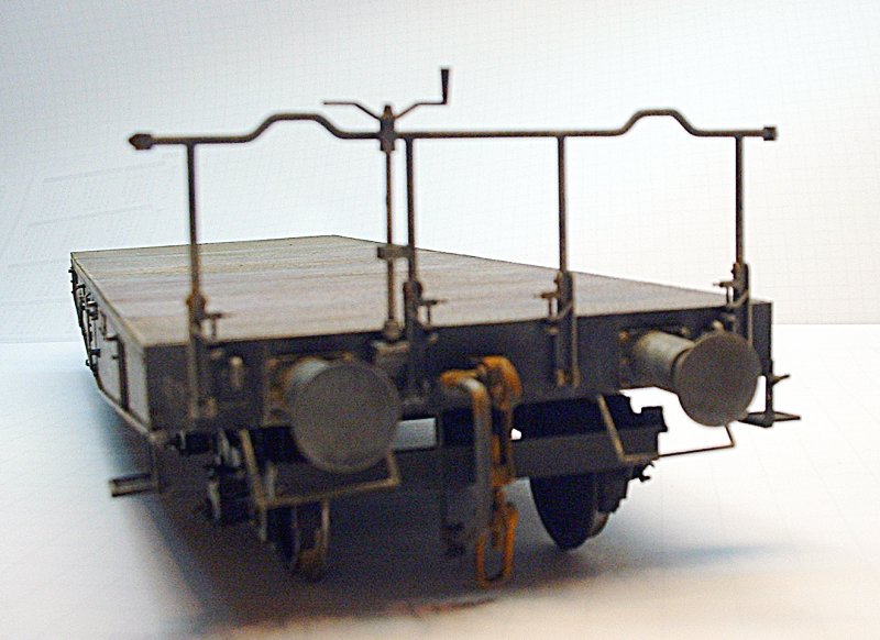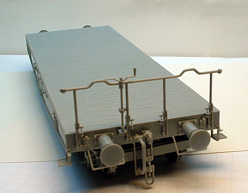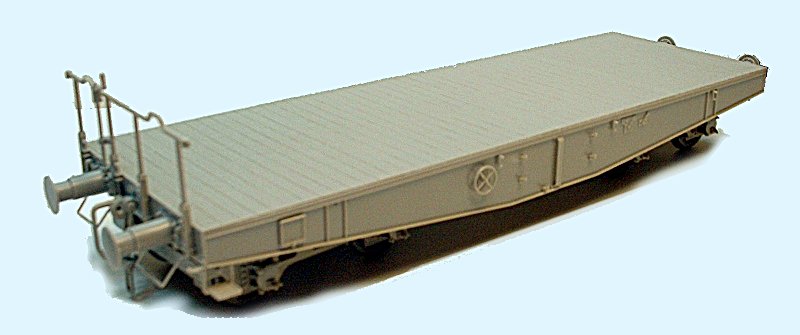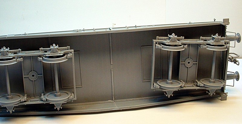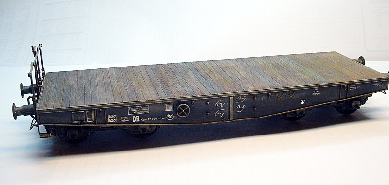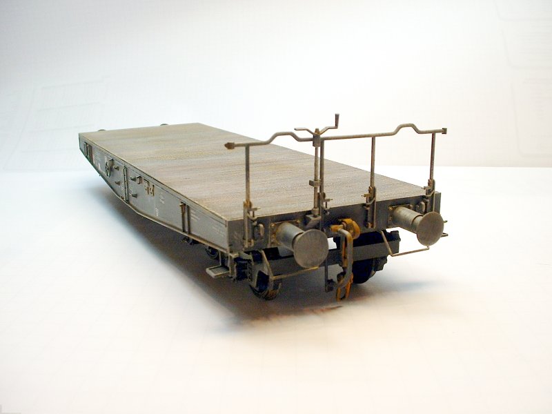 Bemalung: Ich benutzte TAMIYA-Farben. Zuerst wurde das Modell mit Schwarz grundiert. Dann spritzte ich die Fahrgestelle und den Unterteil des Wagons etwas graue Farbe (nur Nebel). Nun erfolgte ein wenig Aufhellen mit noch heller grauer Farbe (Highlighten).