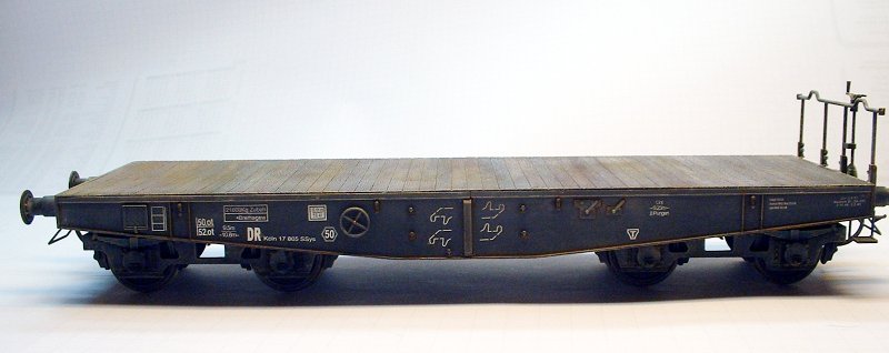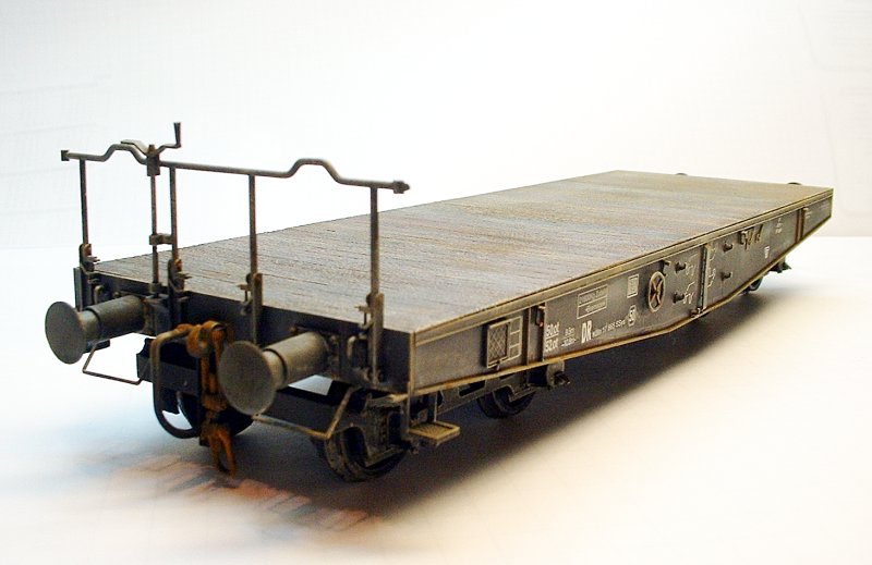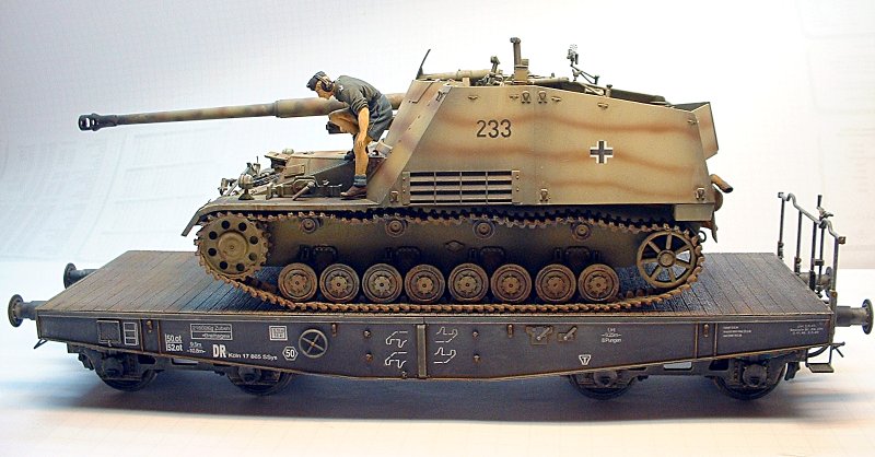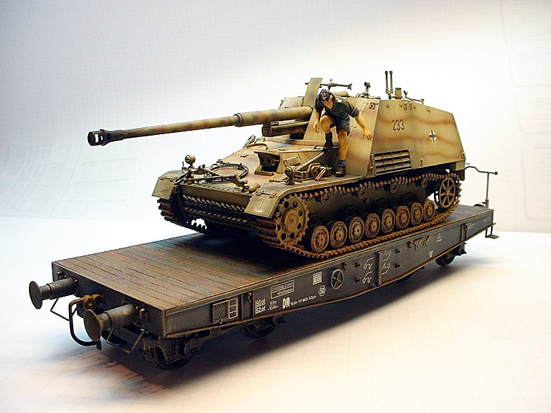 Nach diesem Arbeitsgang erfolgten das Detailwashing mit Umbra und dann das Trockenmalen mit Ölfarbe. Abschließend noch das Modell mit Pastellkreide der Firma Schminke "verstauben". Rost wurde an einigen Kanten angebracht. Dazu verwendete ich "echten Rost" -korrodierte Metallspäne von einer Flächenschleifmaschine.