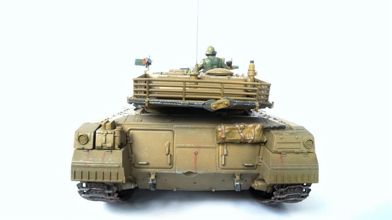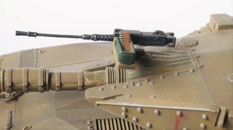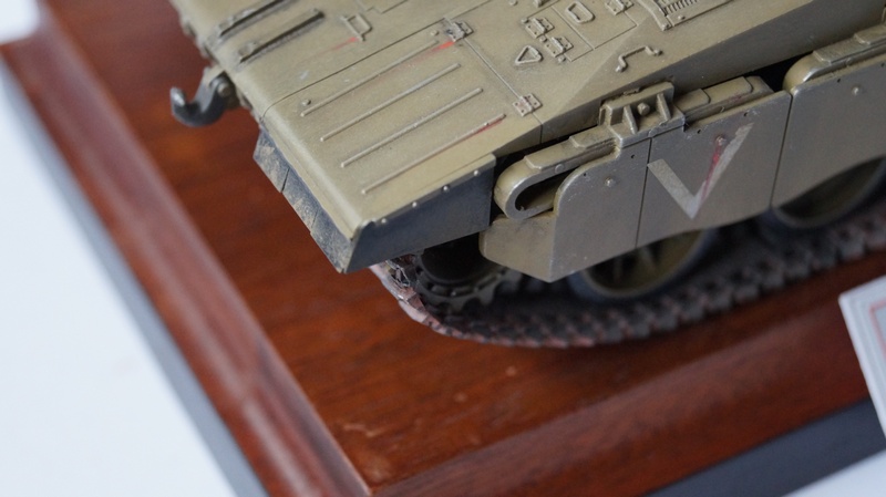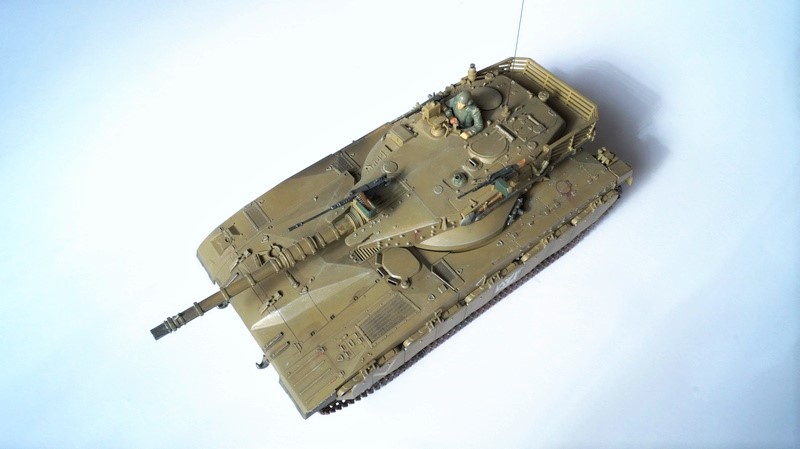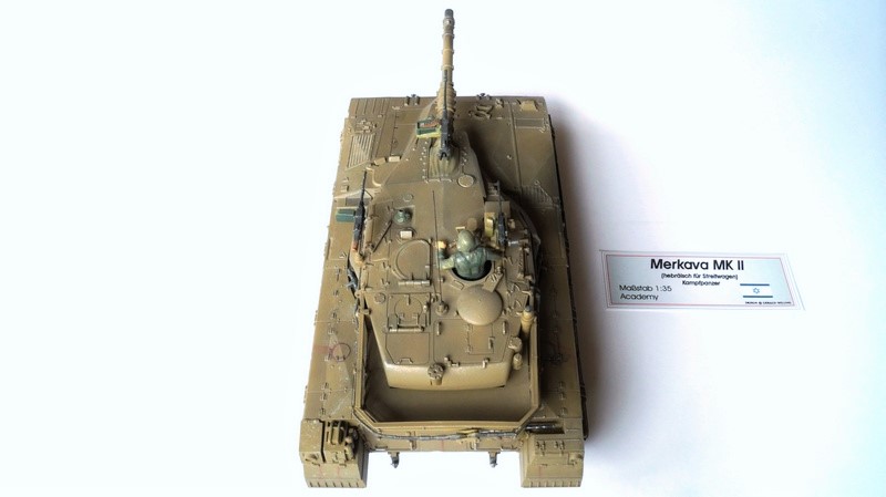 Zum Modell: Gebaut wurde wie immer out of the Box. Zu diesem relativ betagten Academy Bausatz kann ich nichts Negatives sagen. Alle Teile passten gut zusammen, sogar die Vinylkette fügte sich gut in die Antriebskränze ein. Lackiert wurde mit 1706 Sand von Model Master. Die Oberfläche erhielt dann einige Washes mit stark verdünnter schwarzer und brauner Farbe. Ebenso wurden die Abgasspuren mit verdünntem Schwarz mit der Airbrush aufgenebelt. Es wurden Roststellen mit einem roten Wachsstift aufgebracht und im Anschluss mit Terpentin nach unten verwischt. Es folgte eine Versiegelung mit Klar Matt von Revell. Versehen wurde das Model noch mit einer Figur und dünnem gedrehtem Bindedraht als Antenne.