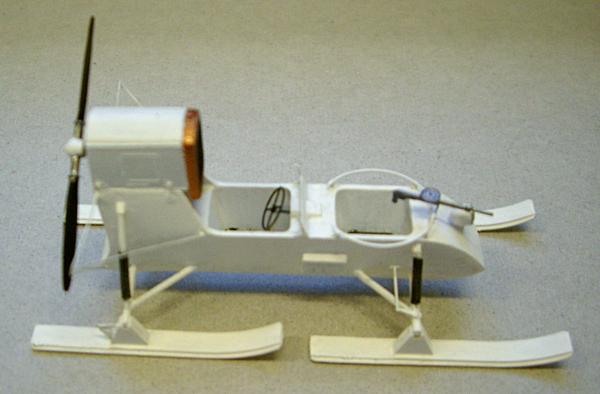 Bemalung: Der Schlitten wurde nach Bauplan und Fotos bemalt. Das heißt der Schlitten ist weiß das MG und der Motor eisenfarbig/ brünniert, der Kühlerrahmen Kupfer, der Propeller und die Federbeine sind schwarz.