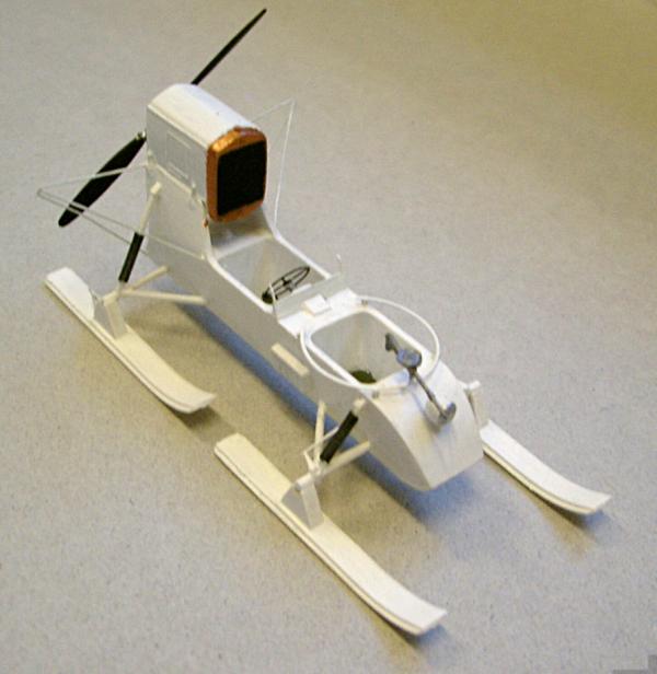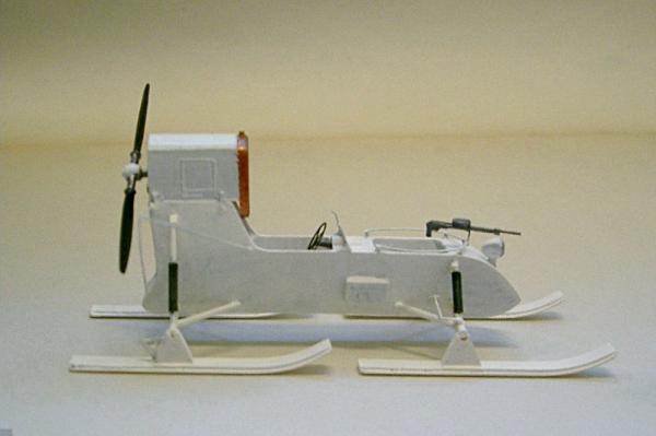 Zum Bau: Schon beim Öffnen des Kasten sieht man das EXTRATECH einen sauber gegossenen Resinbausatz mit nicht zu vielen Fotoätzteilen auf den Markt gebracht hat. Der Bausatz enthält den Schlitten mit Kfz Motor. Die Bauanleitung ist sehr übersichtlich gestaltet und enthält eine Kurzbeschreibung des Fahrzeuges in drei Sprachen. Die Maßstäblichkeit des Bausatzes ist gut. Der Propellerdurchmesser und der Schutzrahmen sind 2 mm zu groß geraten. Wenn die für Resin kleinen Grate entfernt wurden, geht der Zusammenbau rasch von der Hand, da die Teile gut zusammenpassen ist auch keine Nacharbeit erforderlich. Decals sind logischer weise keine enthalten, da auf den bekannten Fotos schließlich auch keine Kennzeichen zu erkennen sind. Leider fehlt die Frontscheibe, aber die kann man sich entweder aus seiner Ersatzteilkiste heraussuchen oder aus Folienresten zurechtschneiden.