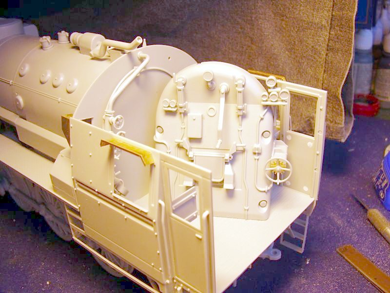 Im Bauabschnitt wird der Lokführerstand gebaut den ich zwecks späterer Bemalung noch nicht zusammengeklebt habe. Im Abschnitt 12 wird der Kessel auf die Halter am Rahmen gesetzt. Hier muß teilweise aufgefüttert werden, damit der Kessel auch überall aufliegt. Als die Gummileitungen am Kessel angeklebt werden sollten, bekam ich eine Krise, denn kein Kleber wollte richtig halten. Das Entfetten der Gummiteile brachte nicht viel, es half zum Schluss nur noch 2-Komponenten Kleber und teilweise ein Sekundenkleber.