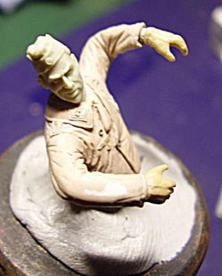 Einen Torso habe ich runter geschliffen und dann den Draht in gebohrte Löcher daran befestigt am anderen Ende des Dahtes werden die Hände angebracht. Der Drahtarm wird nun so gebogen wie man ihn haben will und dann wird noch der Kopf aufgesetzt. Nun wird Stück für Stück mit Modeliermasse die Jacke und die Arme aufgebaut.