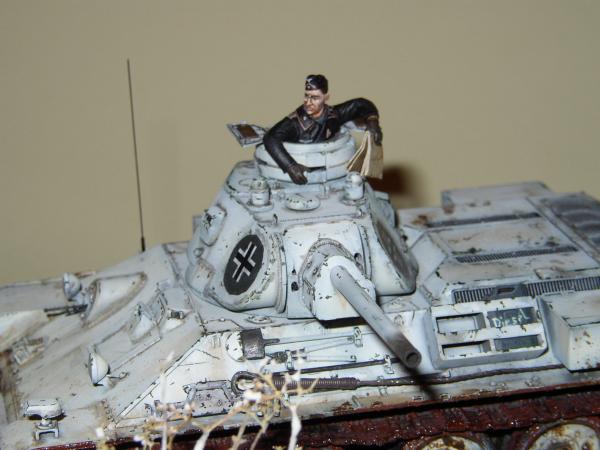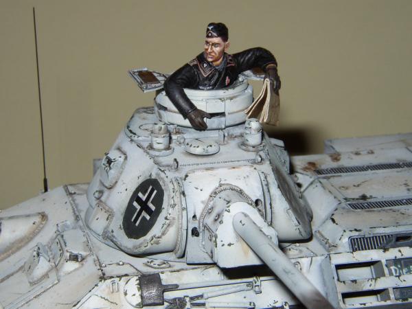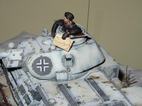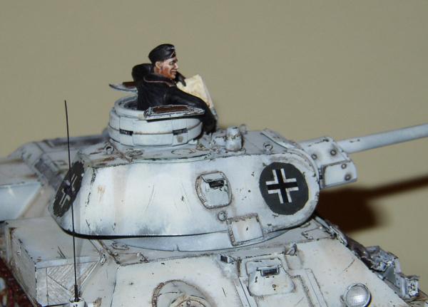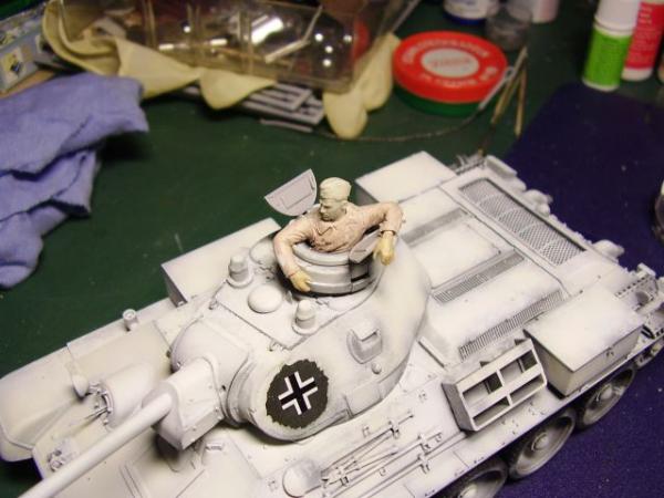 Nun felte mir noch ein wenig Leben und ich suchte die passende Figur in Gestalt eines Deutschen Panzermannes der aus der Kuppel schaut. Doch alles suchen half nichts es wollte keiner so richtig passen. Also entschloß ich mich diese Figur, in diesem Fall eine halbe, selbst zu gestalten. Was ich schon sehr oft bewundert habe, habe ich nun das erste mal selbst versucht. Mit hilfe von einem Kopf von Hornet, Händen einer Tamiya Figur und Draht für die Arme konnte es los gehen.
