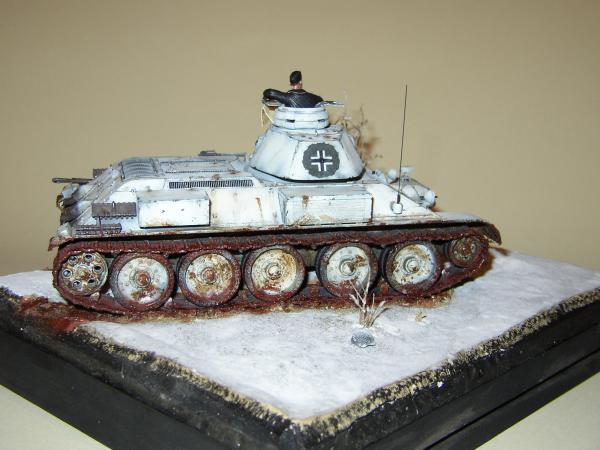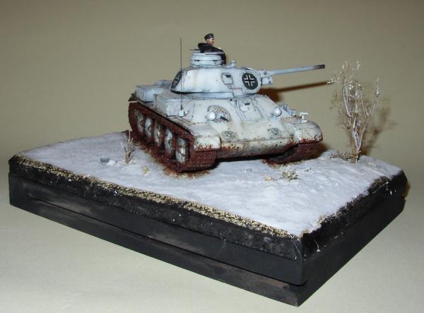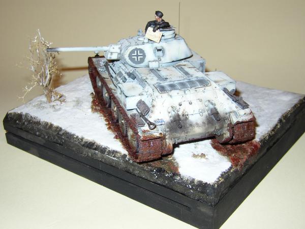 Dann wollte ich den Panzer noch auf eine kleine Geländeplatte stellen. Dazu nahm ich ein Holzbrettchen und darauf kam etwas Styropor. Umklebt mit Klebeband und aufgefüllt mit Gips etwas Zeit und fertig war der Abstellplatz. Ein paar trockene Zweige und der Schnee aus Micro Balls und es war kalt.
