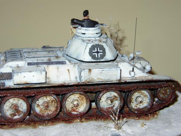 Ich habe noch die großen Staukisten mit kleinen Scharnieren von ABER versehen, die Werkzeughalterungen mit Ätzteilresten an den Verriegelungen bestückt und das Abschleppseil ergänzt. Lackiert d.h. grundiert wird alles in russisch-grün Humbrol 114. Für die Balkenkreuze wird etwas Abdecklack auf dem Turm angebracht, damit er dort grün bleibt. Mit etwas weiß in dem Grundton wird das Modell etwas aufgehellt. Darauf folgt nun ein wolkiger Farbauftrag mit Vallejo Creme-weiß 820 so das man das Grün noch etwas sieht.