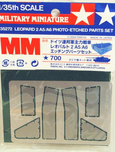 Wer seinen Leopard 2A5/6 aufwerten will und der, anstatt im Bausatz vorhandenen Gase, die am Turmheck befindlichen Körbe mit Ätzteilen verfeinern will, hat jetzt die Möglichkeit dazu. Tamiya hat passend zum Erscheinen des Leopard 2A6 die Ätzteile auf den Markt gebracht. Diese Gitter weisen die richtige Detaillierung in Form eingestanzter Löcher auf. Auch Besitzer des von Tamiya herausgebrachten Leopard 2A5 können zugreifen. Die Turmkörbe sind identisch. Sehr zu empfehlen.