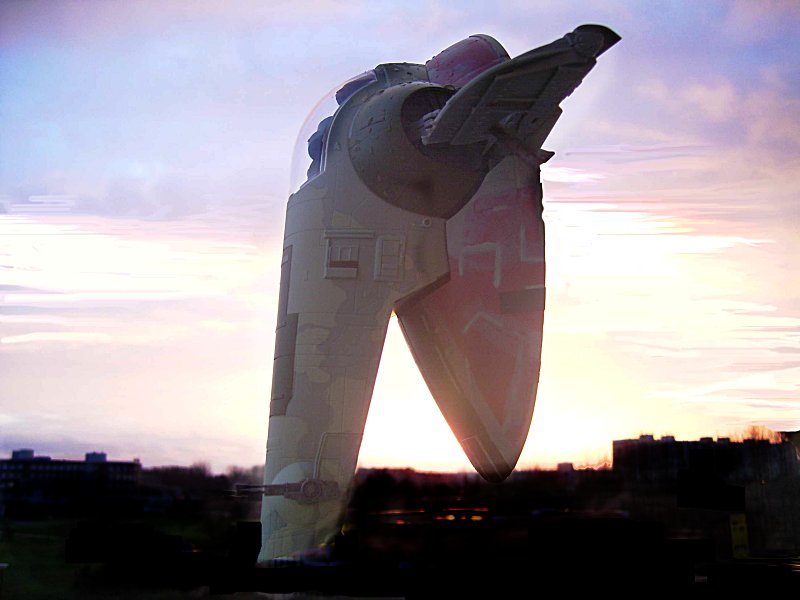Es handelt sich um das Kampfschiff des Kopfgeldjägers Jango Fett, der sich in Episode II mit seinem Sohn Boba gegen Obi Wan eine kleine Raumschlacht liefert. Die aufwendig computeranimierten Szenen des Films waren ein Höhepunkt. Ich muss gestehen, dass selbst ich wie im Rausch meinen Slave I zusammengesteckt und den Kampf nachgespielt habe.