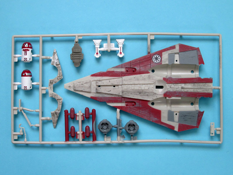 Alle Teile sind wieder vorgefärbt, mit Wappen versehen und auch gealtert. Mit Hilfe eines Erwachsenen können Kinder ab 8 Jahren die Kits bauen, wobei durch das bewährte Stecksystem Klebstoff nicht von nöten ist. Neben einem Ständer verfügt sowohl Anakin's als auch Obi-Wan's Schiff über Landestützen, so dass es auf dem Boden stehend in Szene gesetzt werden kann. Der Astromech-Droide lässt sich separat bauen und neben dem Modell platzieren.