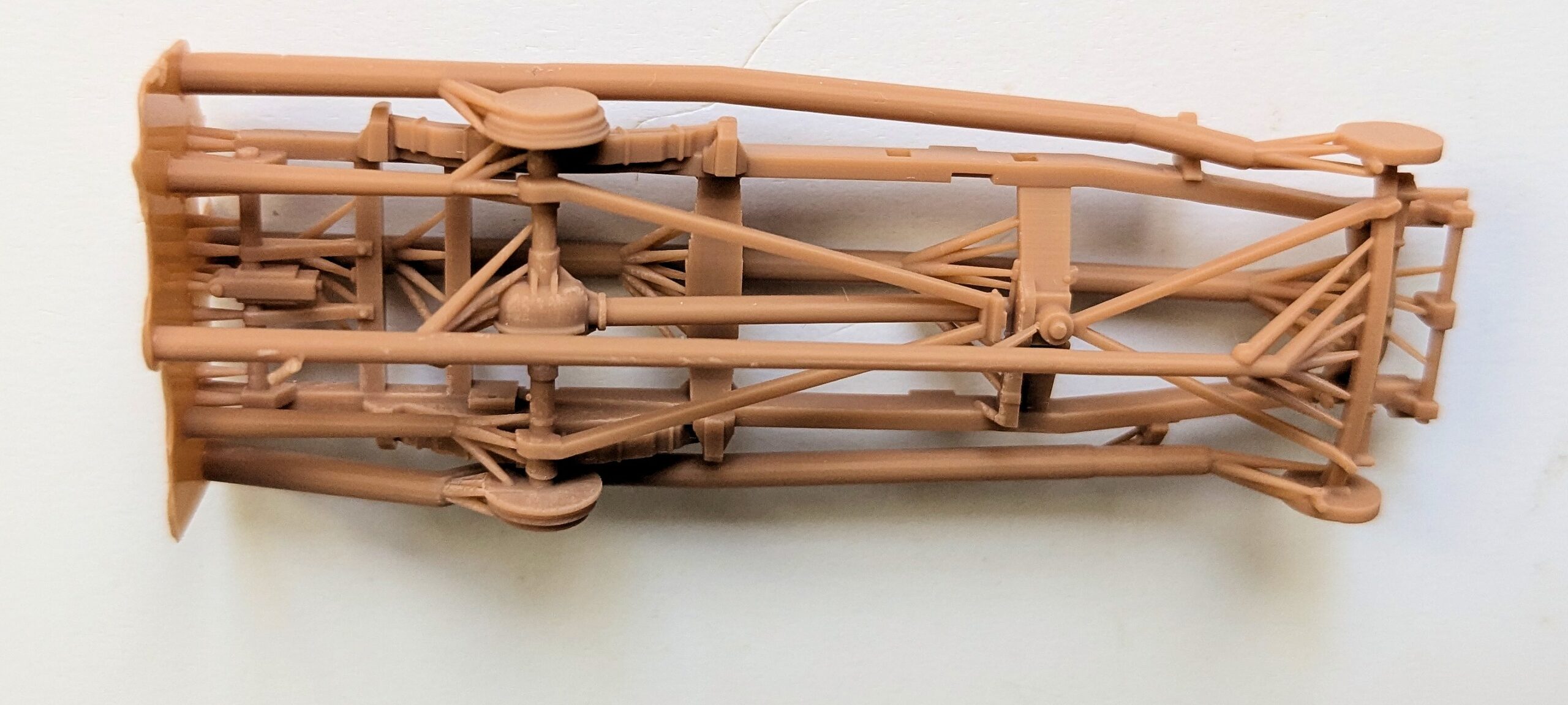 Das 3D-gedruckte Fahrgestell befindet sich in einem extra Rahmen als Transportschutz, damit die filigranen Teile nicht brechen. Die Angüsse der 3D-Teile sind dabei so gewählt, dass sie nach dem Heraustrennen keine große Nacharbeit erfordern.