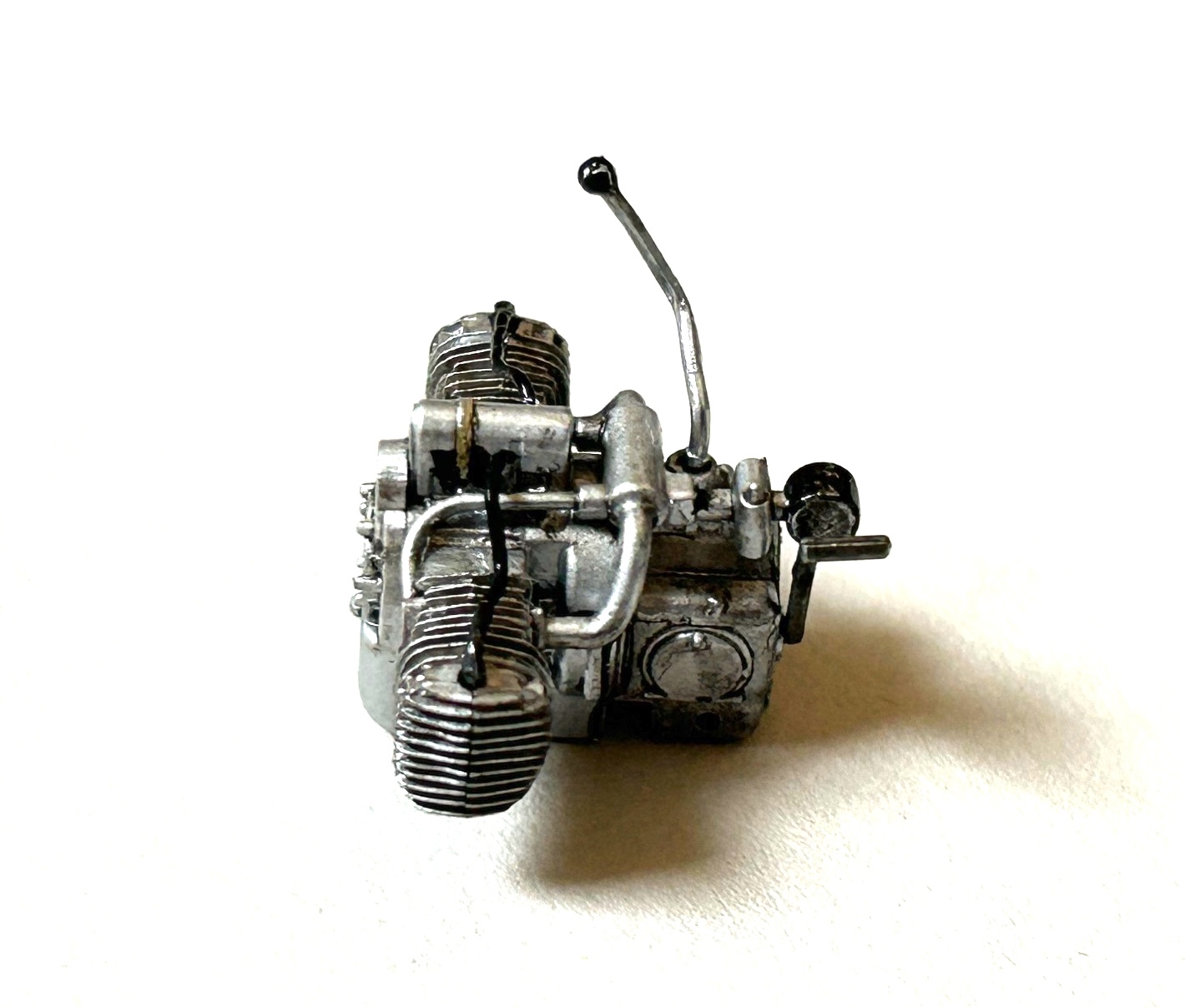 Im nächsten Schritt wurden die Teile für den Motorblock zusammengebaut, der nach einer Grundierung mit glänzender schwarzer Farbe und anschließendem Auflackieren unterschiedlicher Metallfarben aus der Vallejo Farbpalette wirklich beeindruckend gut ausfällt. Die Zündkabel wurden noch aus dünnem Bleidraht ergänzt.