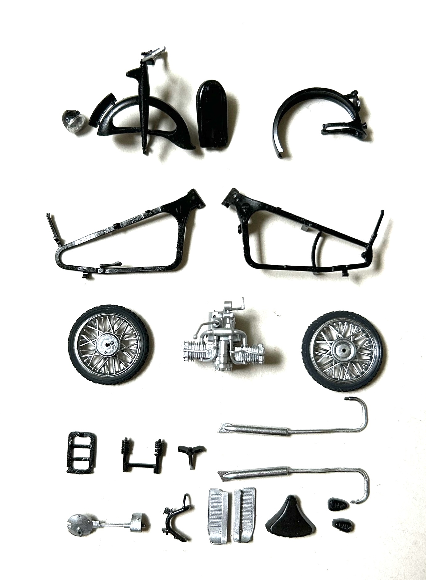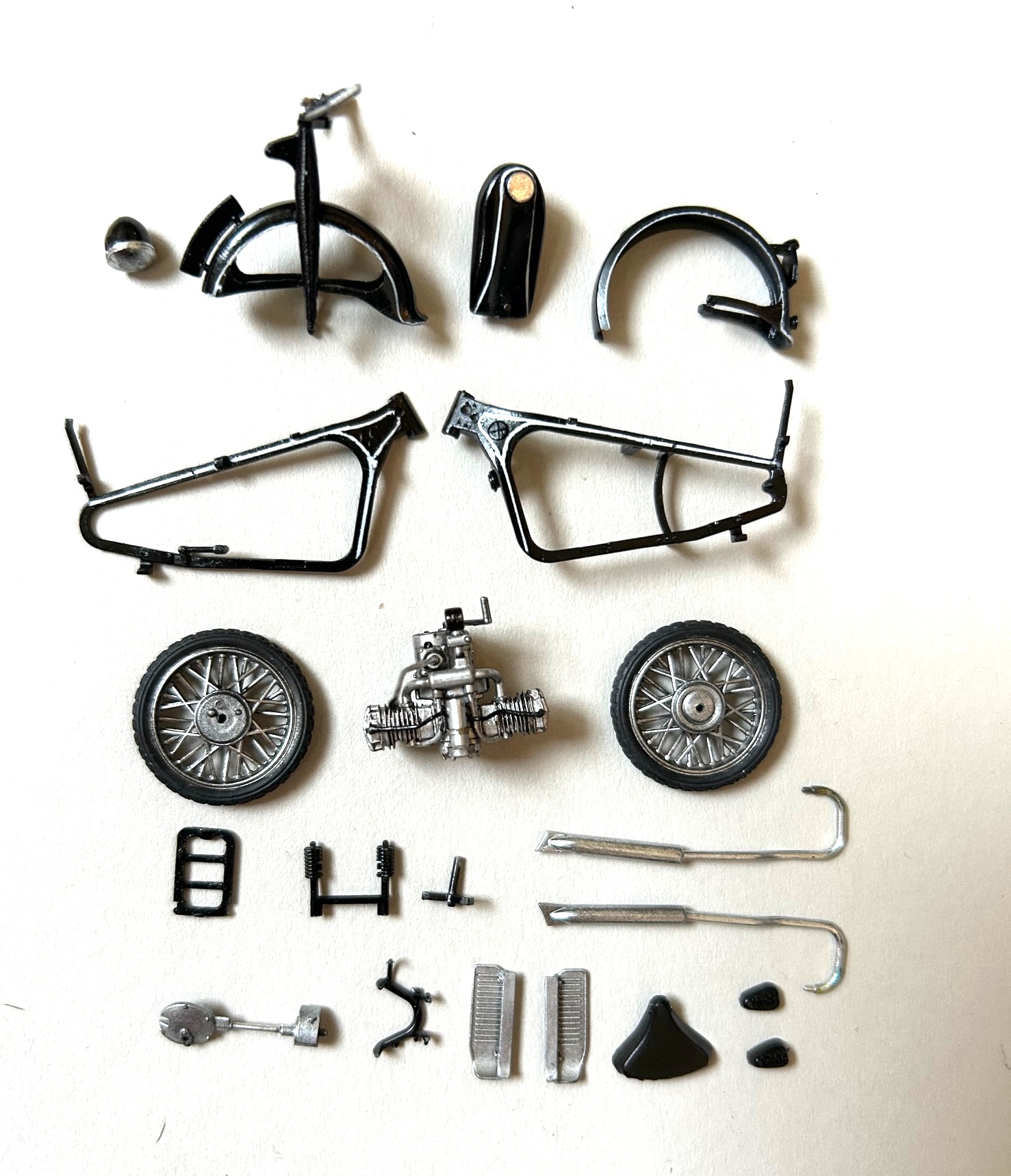 Ein erster Abgleich der Bauteile mit Fotos vom Original zeigte, dass Zvezda auch bei diesem Bausatz sehr gute Arbeit geleistet hat, denn das Design ist absolut stimmig ausgeführt. Auch kleinste Details findet man in korrekter Form umgesetzt. Besonders beeindruckt haben mich die hauchdünn ausgeführten Lamellen an den beiden Zylinderblöcken. Hut ab! Einen weiteren Pluspunkt vergebe ich an Zvezda für die tolle Gestaltung des Lenkers. Auch der sieht einfach klasse aus. Ein dritter Pluspunkt kann für die Speichenfelgen vergeben werden. Diese könnten zwar noch etwas dünner ausfallen, aber für Plastikspritzguss sehen sie wirklich gelungen aus. Zusammengefasst kann man sagen, dass Zvezda mit diesem Bausatz wirklich eine hervorragende Basis für den Bau eines tollen Modells anbietet.
