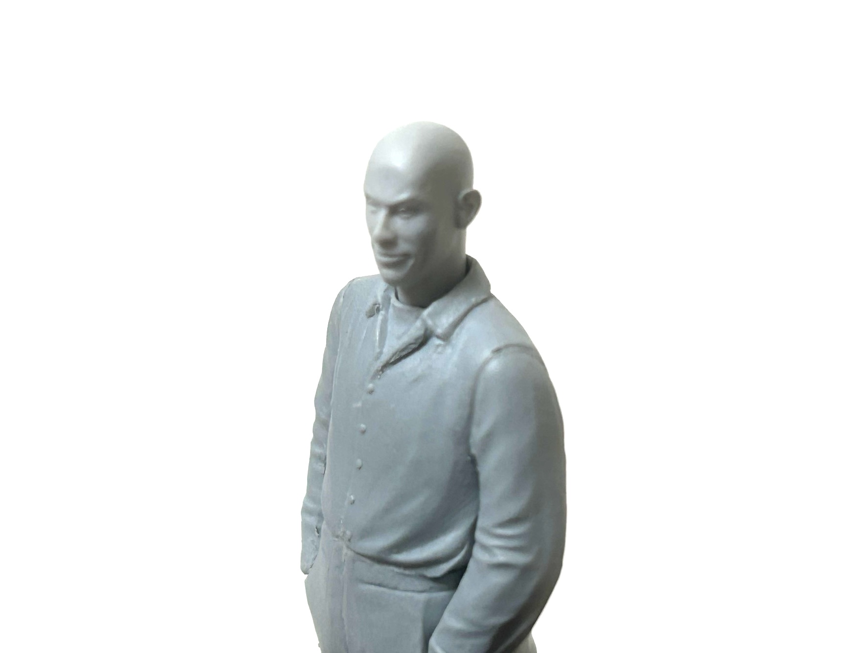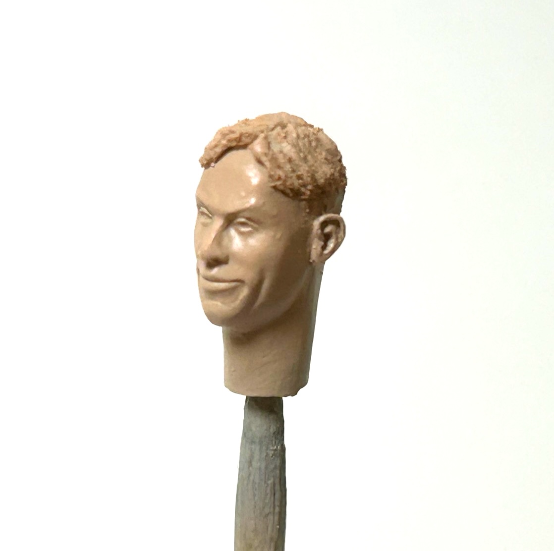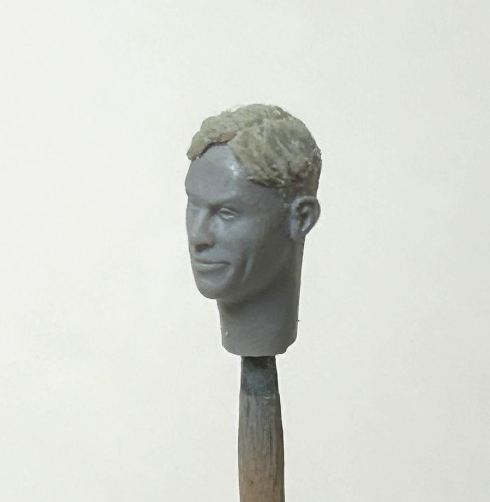 Auch dieses Modell wollte ich zusammen mit einer Bikerfigur präsentieren. Für den Rumpf des Zivilisten konnte ich schließlich die Figurenteile aus einem MasterBox Bausatz nutzen, die ich mit einem Resin Kopf von Hornet ausgestattet habe. Der „Glatzkopf“ sieht zwar auch nicht schlecht aus und erinnerte mich etwas an Telly Savalas in Kojak (den kennen wahrscheinlich nur noch die etwas älteren Modellbaukollegen), aber es sollte dann doch eine der Zeit entsprechende Frisur sein, die aus MagicSculpt modelliert wurde.