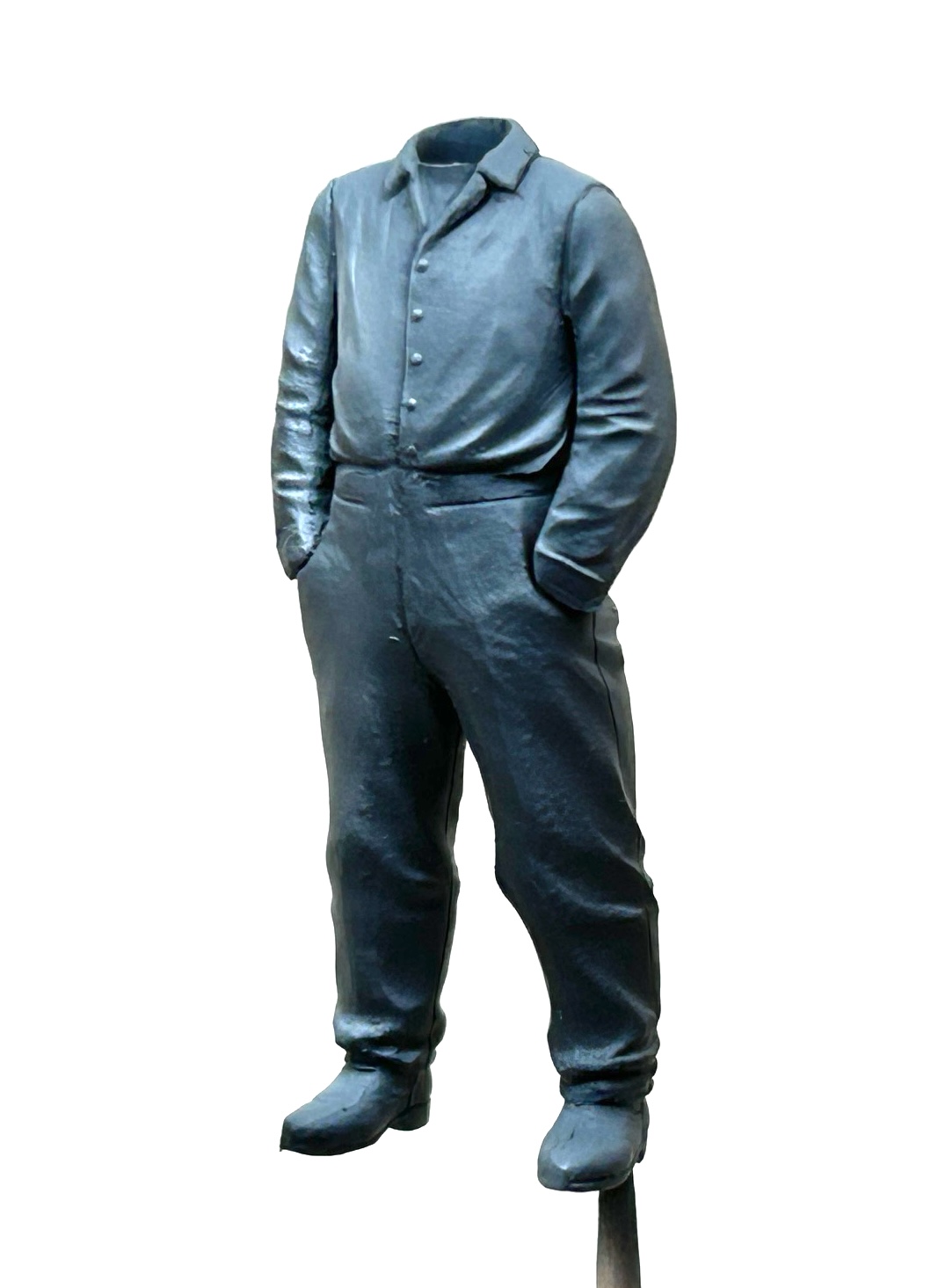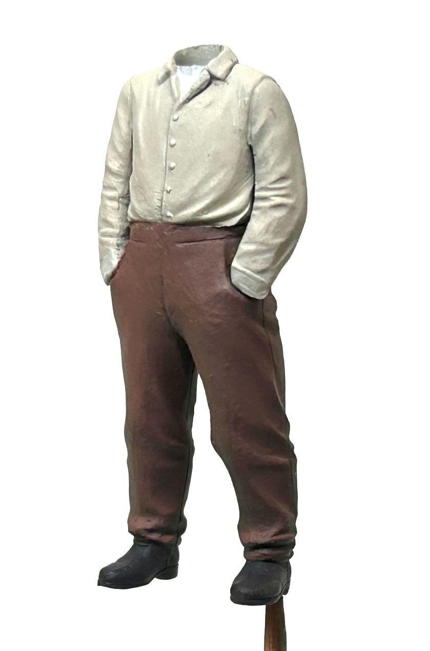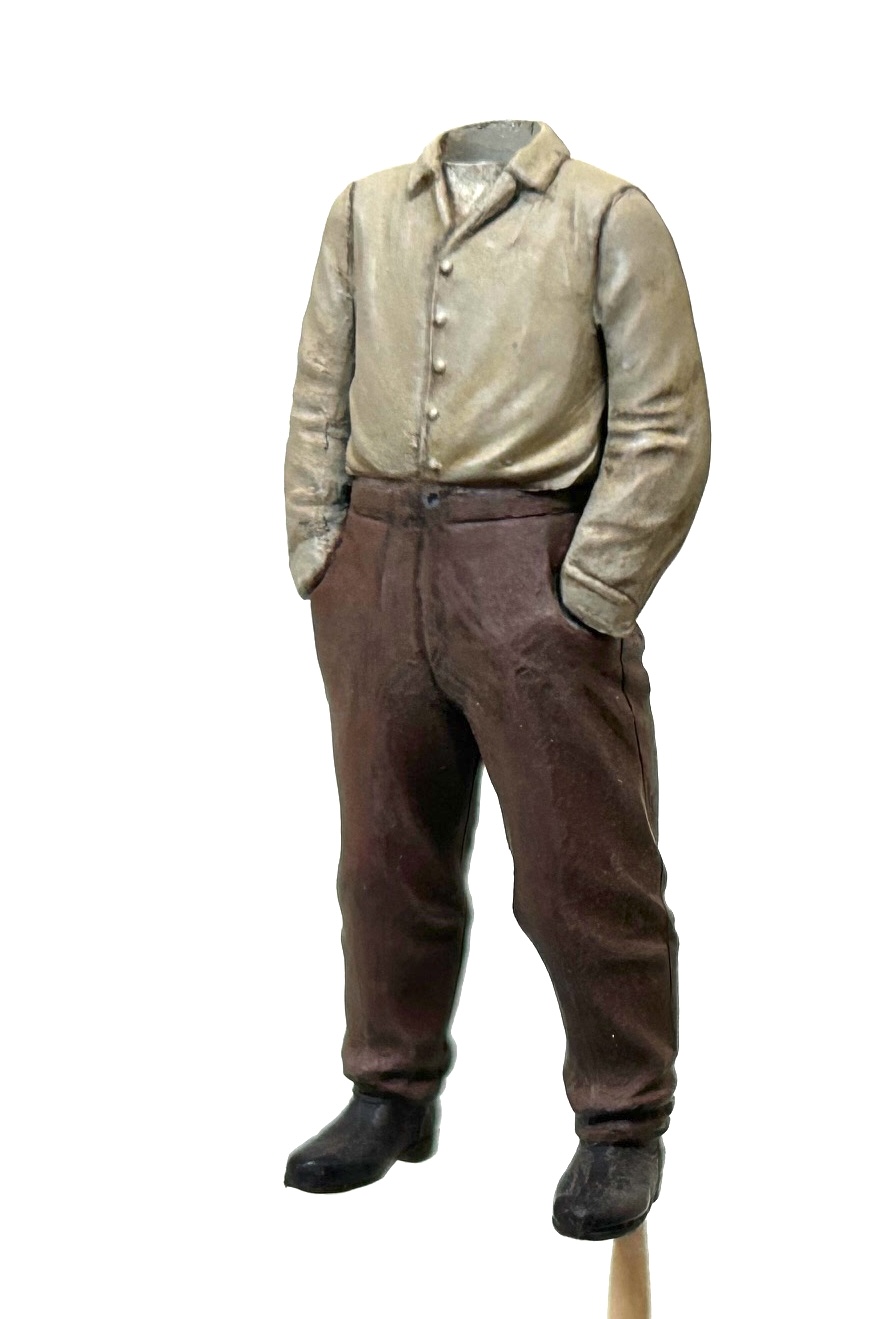 Bei der Figur habe ich diese nach einer Grundierung mit schwarzer Farbe mit weisser verdünnter Farbe von Tamiya von oben mit der Airbrush bemalt um die Figur mit Licht und Schatten für die weitere Bemalung zu versehen. Im Anschluss daran wurde die Hose mit brauner und das Hemd mit hellbeiger Farbe auch mit der Airbrush bemalt und nach ausreichender Trockenzeit weitere Lichter und Schatten gesetzt. Der Kopf wurde separat nach einer Grundierung mit Flesh mit Öl- und Acrylfarben bemalt.
