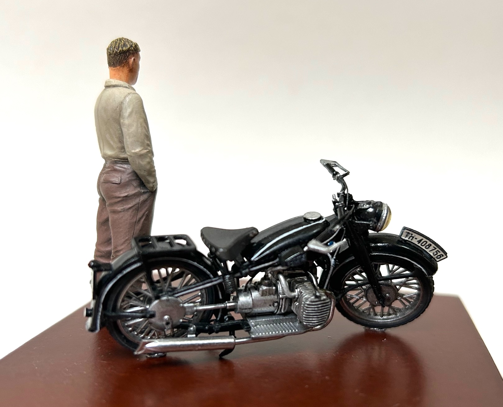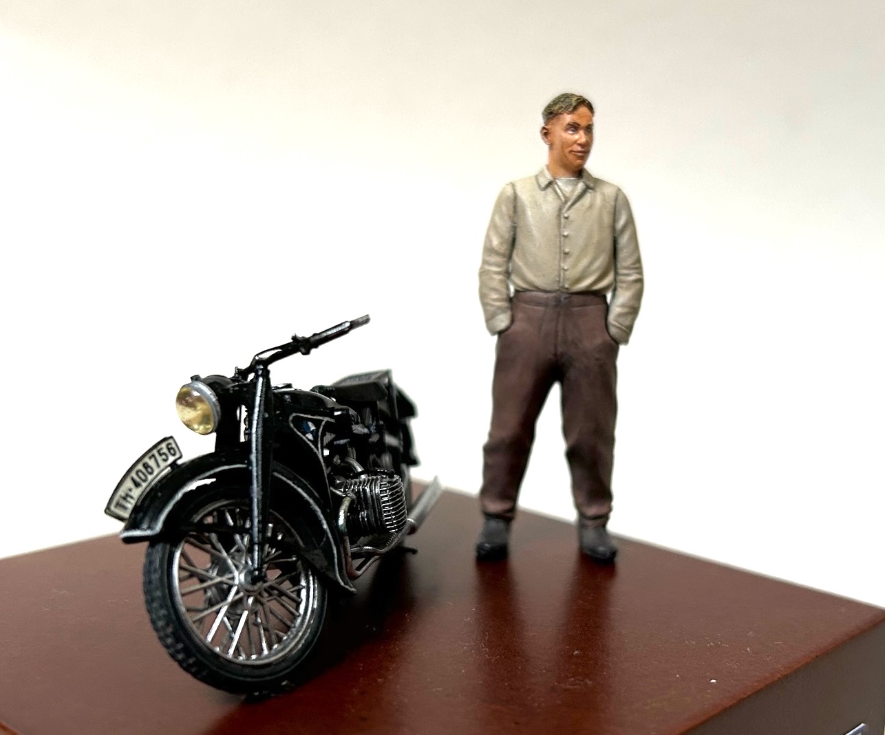 Nach der Bemalung wurde die Figur zusammen mit dem Motorrad auf einem Holzsockel arrangiert.