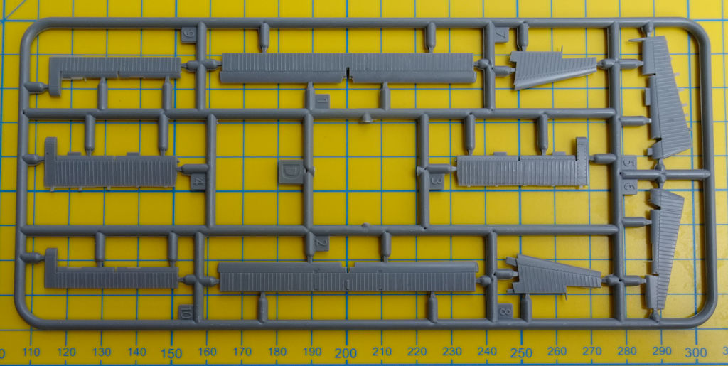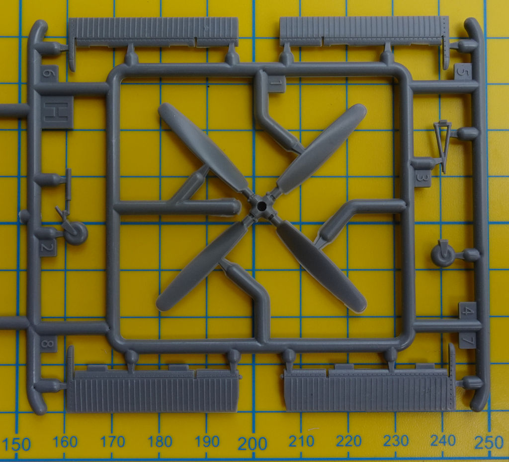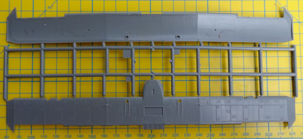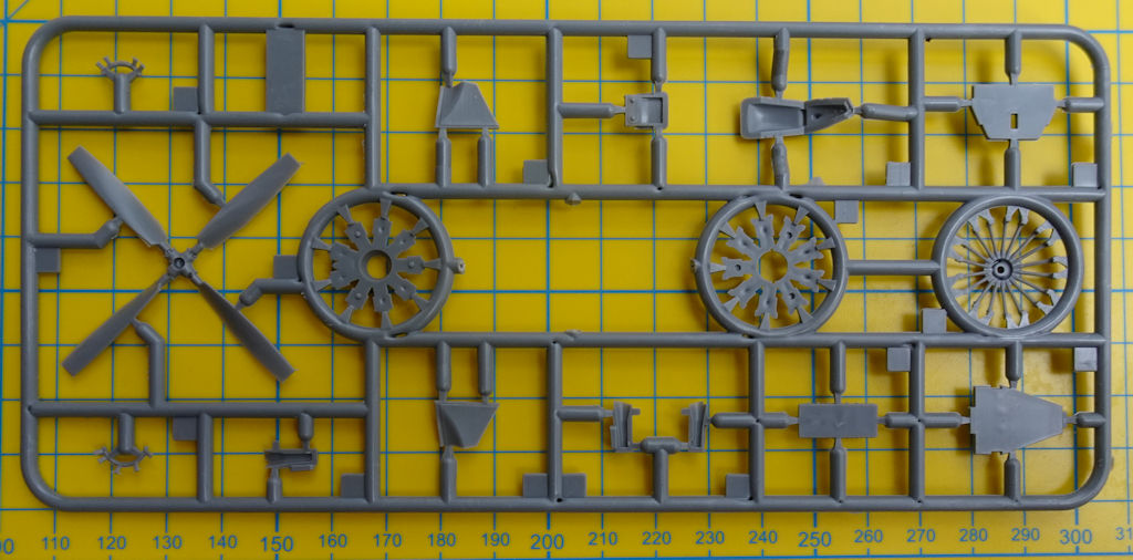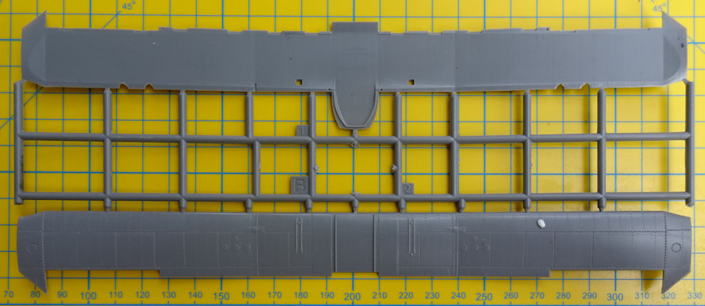 Die Tragfläche entsteht aus Ober- und Unterseite. Dadurch ist die richtige V-Stellung gesichert. Die Landeklappen und die Querruder komplettieren die Fläche. Sie haben alle scharfe Hinterkanten. Aus vier Teilen werden jeweils die Hauptfahrwerksräder zusammengebaut. Die Scheren an den Fahrwerksbeinen stellen zwei Spritzgussteile dar.