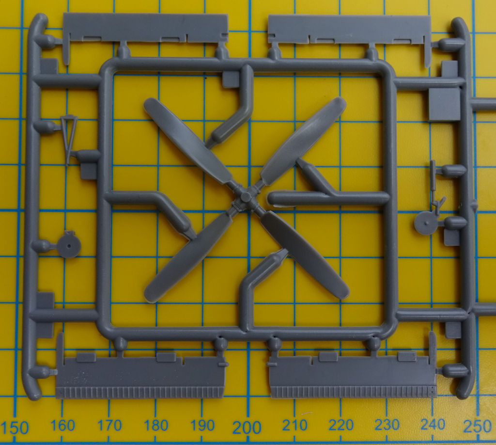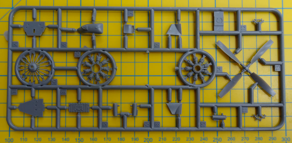 Für den gut sichtbaren Sternmotor werden drei Spritzgussteile zusammengefügt. Zwei Teile für den Auspuff ergänzen den Motor. Die einteilige Luftschraube bekommt noch vier Auswuchtgewichte.