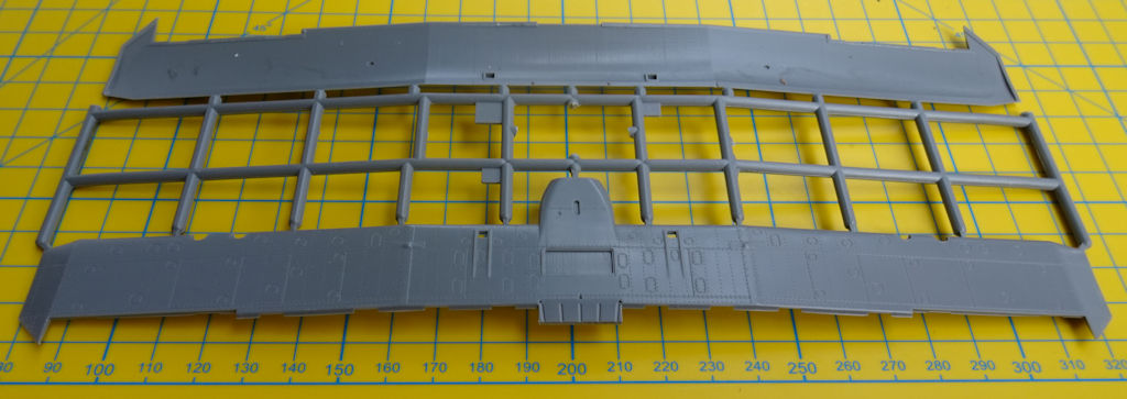 Die Tragfläche entsteht aus Ober- und Unterseite. Dadurch ist die richtige V-Stellung gesichert. Die Landeklappen und die Querruder komplettieren die Fläche. Sie haben alle scharfe Hinterkanten. Aus vier Teilen werden jeweils die Hauptfahrwerksräder zusammengebaut. Die Scheren an den Fahrwerksbeinen stellen zwei Spritzgussteile dar.