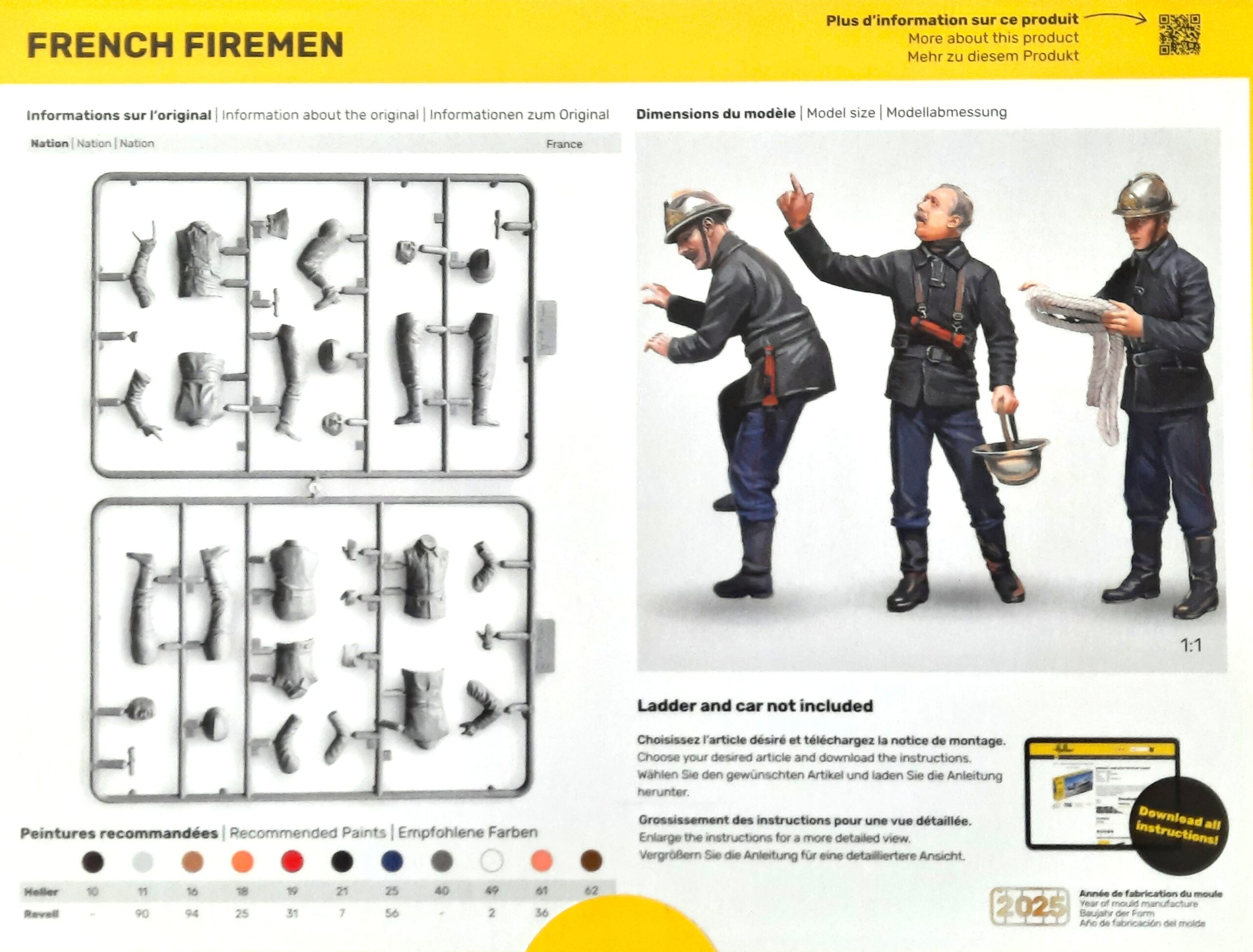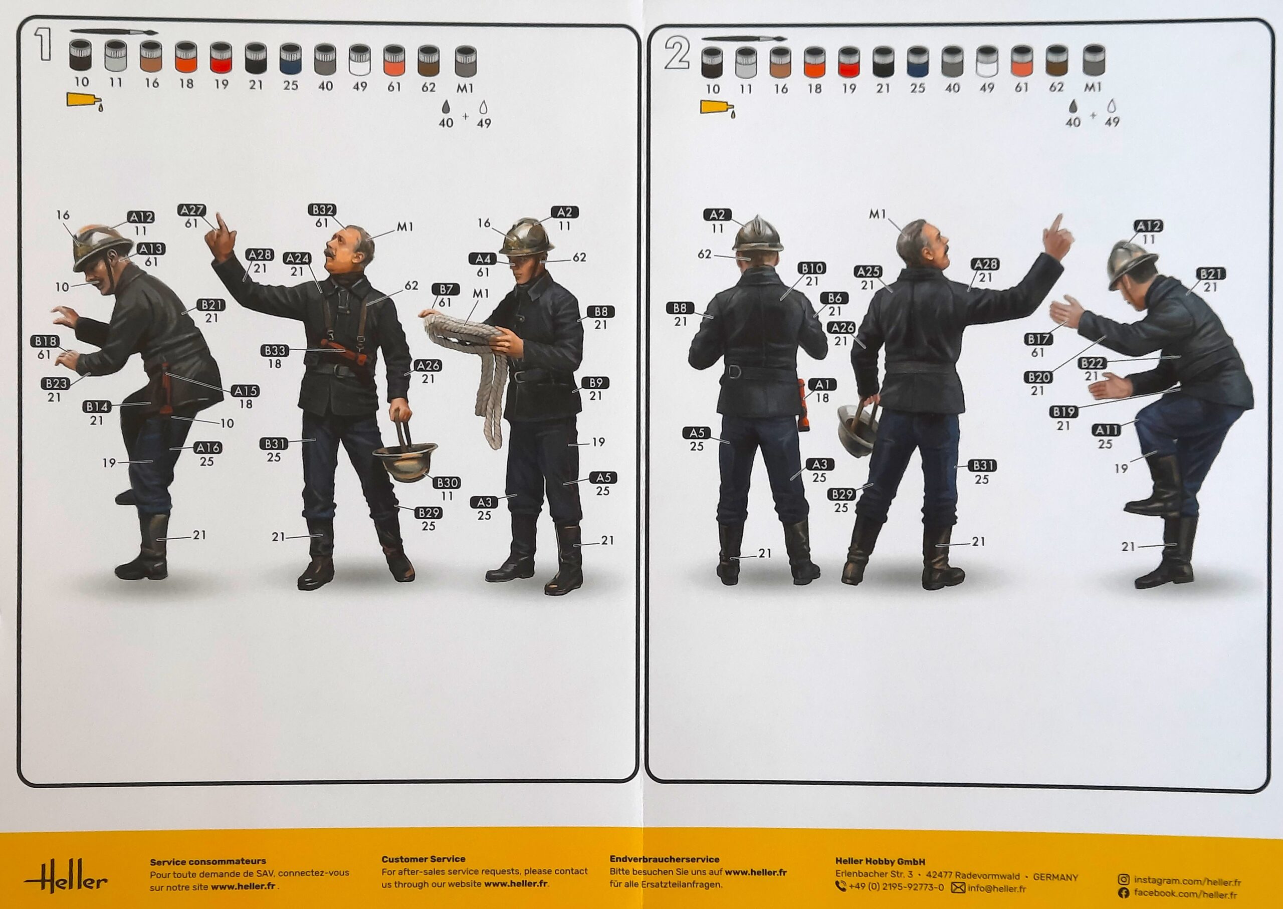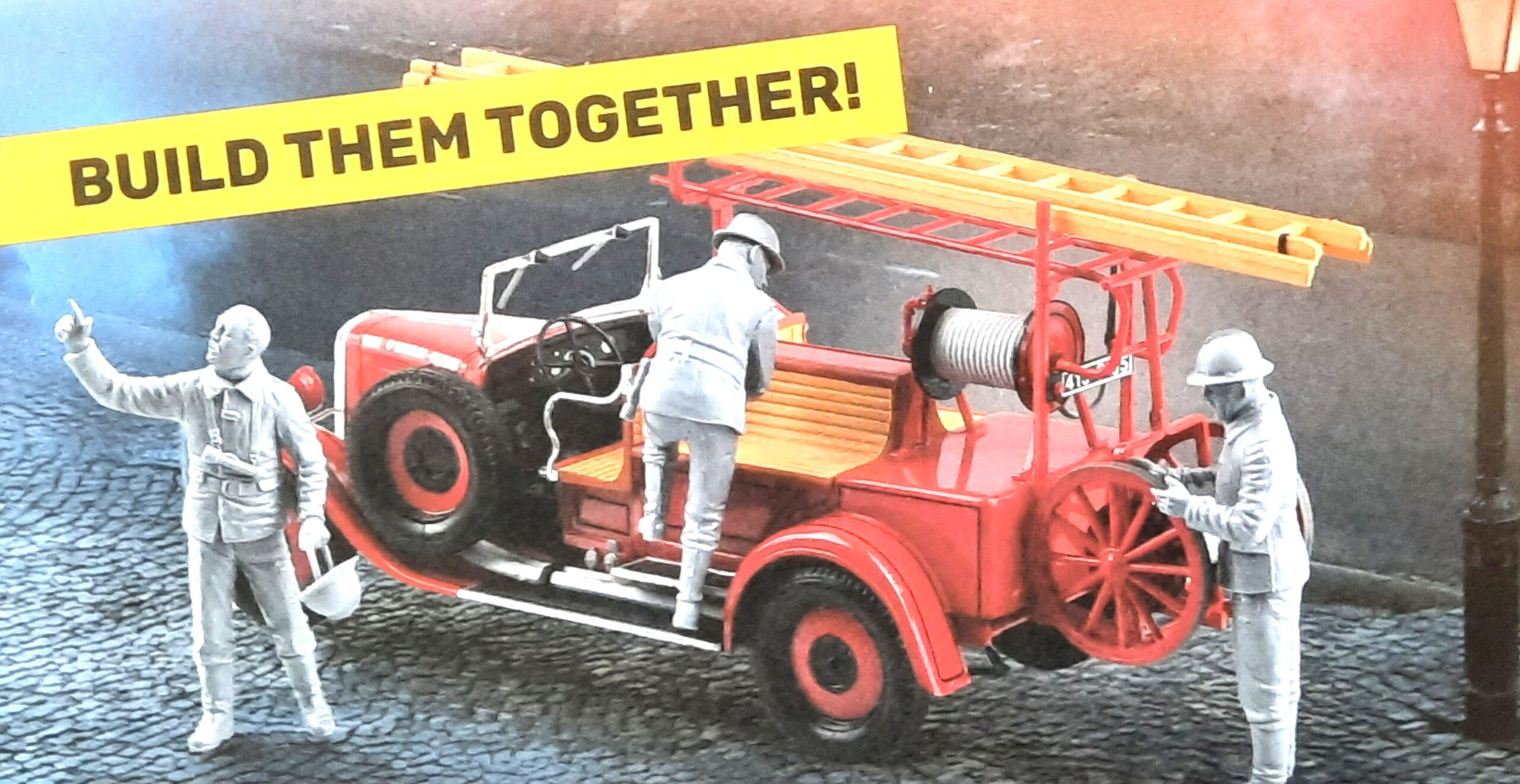 Fazit: Ein interessanter Bausatz der zum Bau eines Dioramas verleitet um dieses Figurentrio in Szene zu setzen. Die zeitlich passenden Feuerwehrfahrzeuge dazu findet man ebenfalls im Heller-Programm.