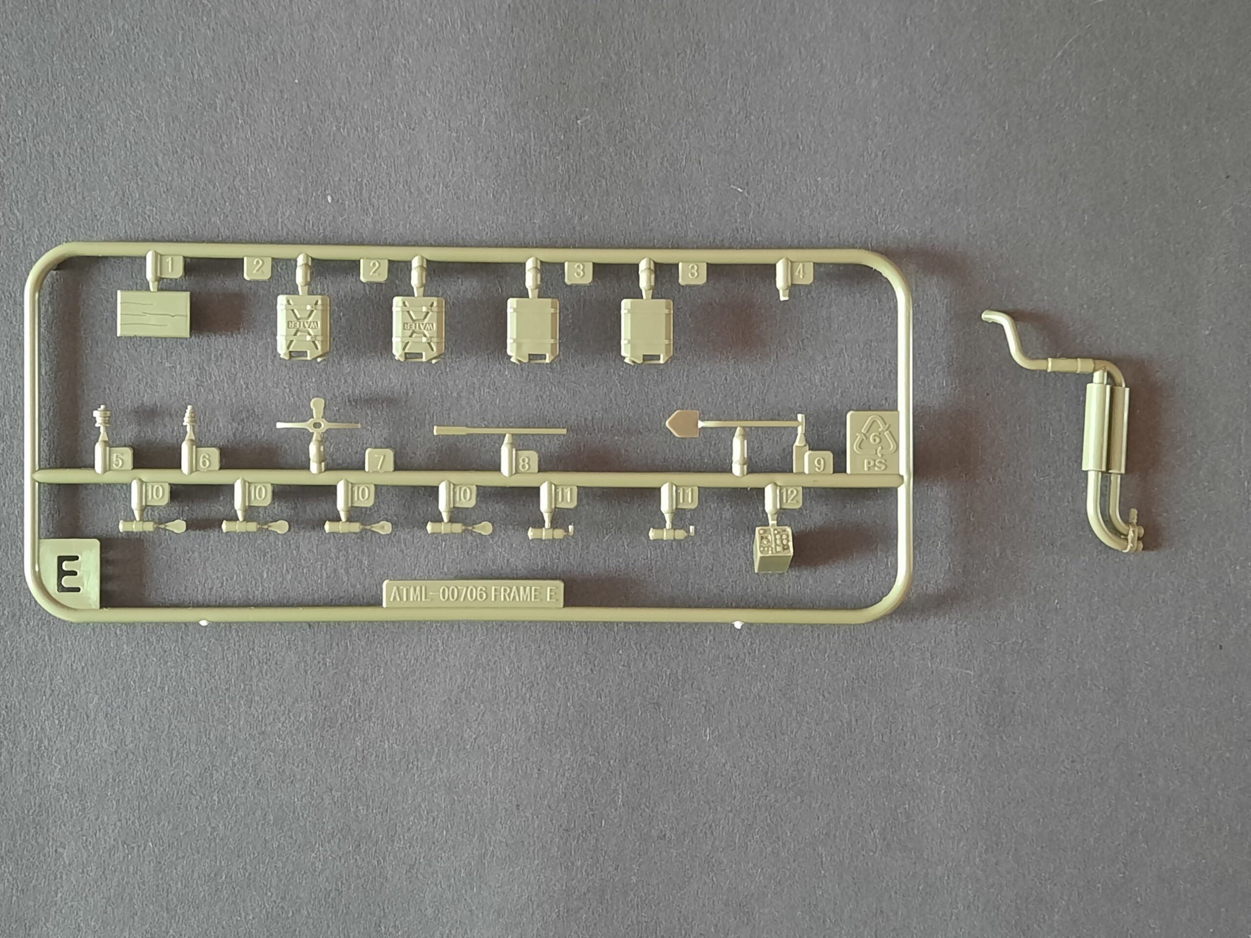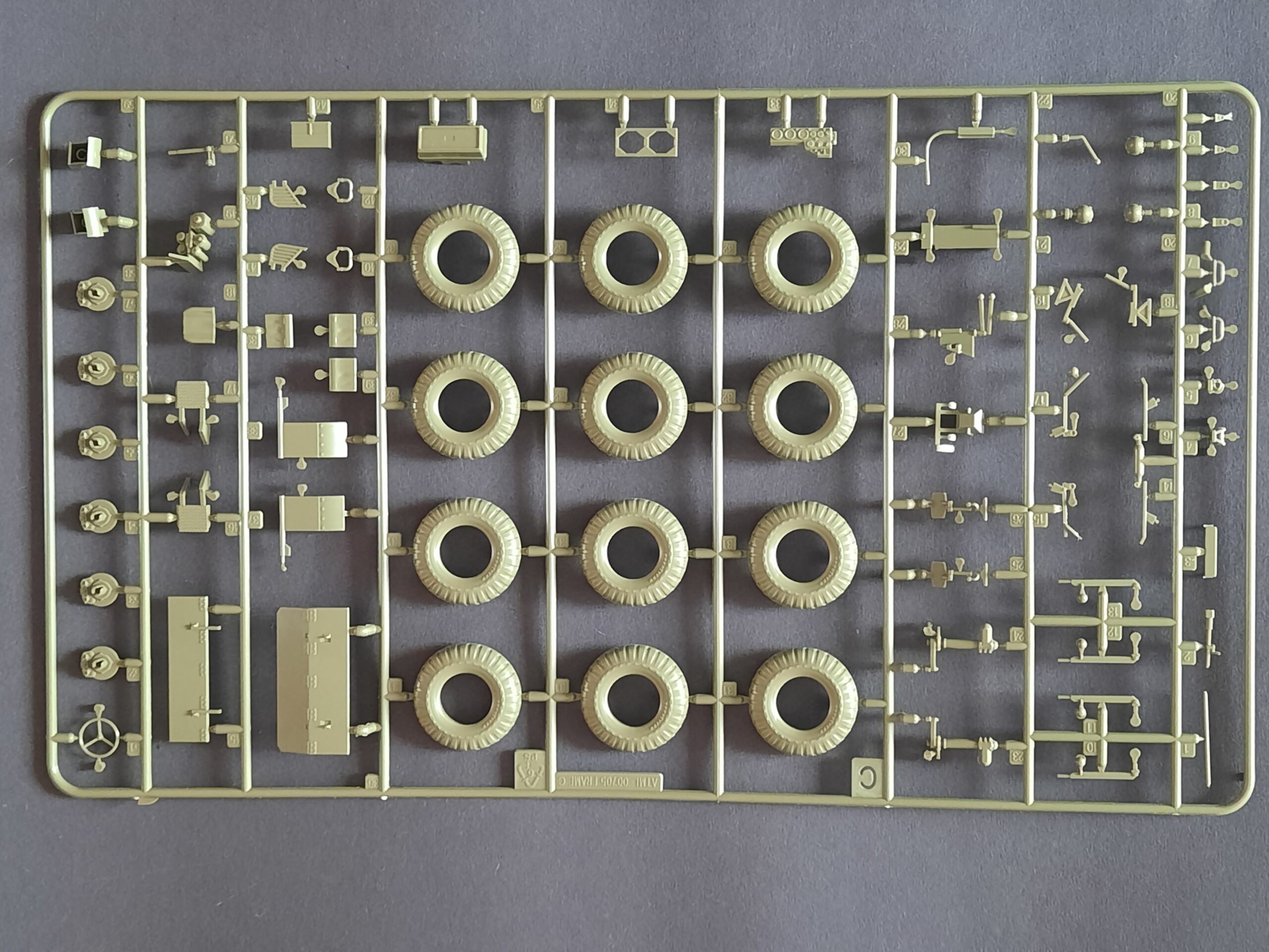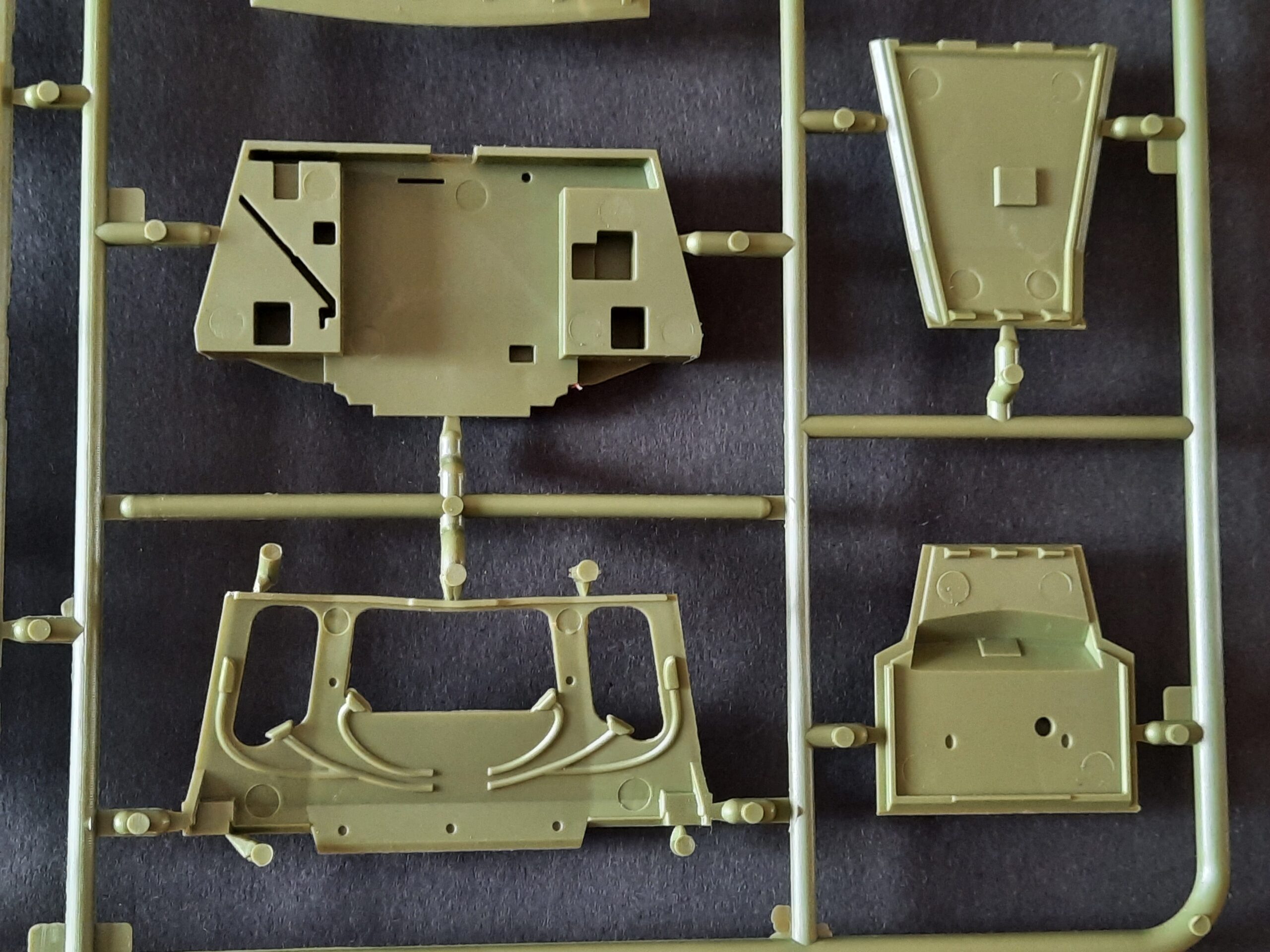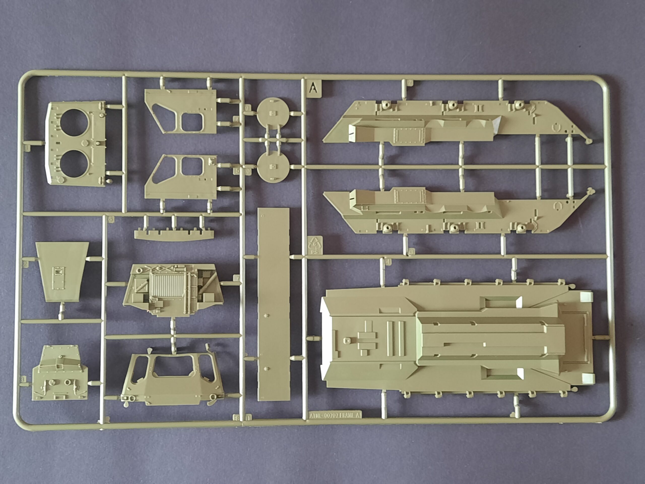 Der Stalwart-Bausatz besteht aus ca. 211 Teilen. Diese verteilen sich auf 7 Spritzrahmen. Dazu gibt es noch einen überschaubaren Decalbogen und natürlich die Bauanleitung. Die Plastikteile sind sauber gespritzt. Großartige Nacharbeiten sind keine zu erwarten. Allerdings sind Auswurfmarkierungen reichlich vorhanden und befinden sich in auf den ersten Blick in nicht oder kaum sichtbaren Bereichen. Wer es perfekt mag, wird an Schleif- und Glättungsarbeiten noch eine Menge Zeit investieren müssen. Ärgerlicher sind noch die Sinkstellen im Material vieler Bauteile. Ein Effekt, der bei heutigen Modellbausätzen gar nicht mehr auftreten sollte.