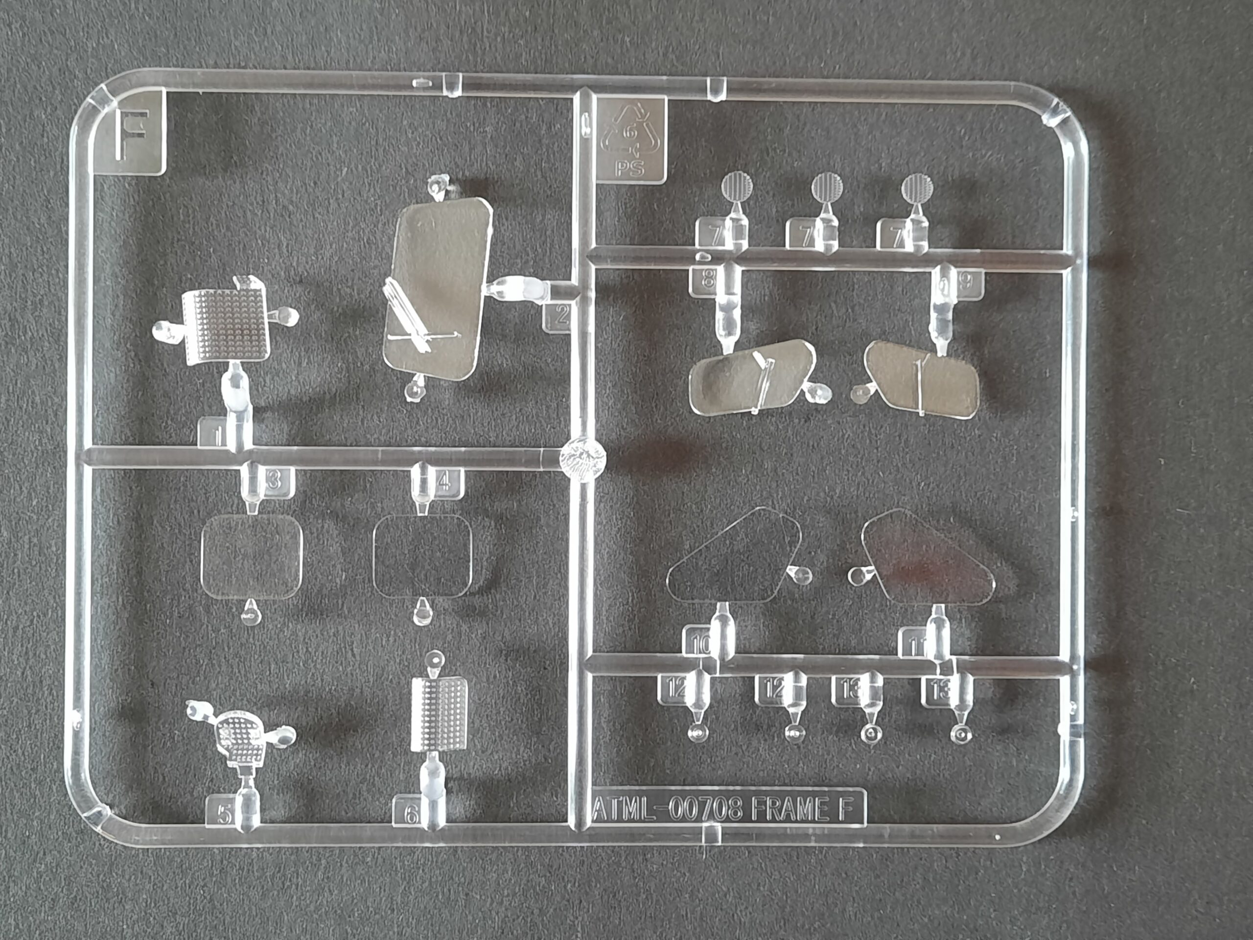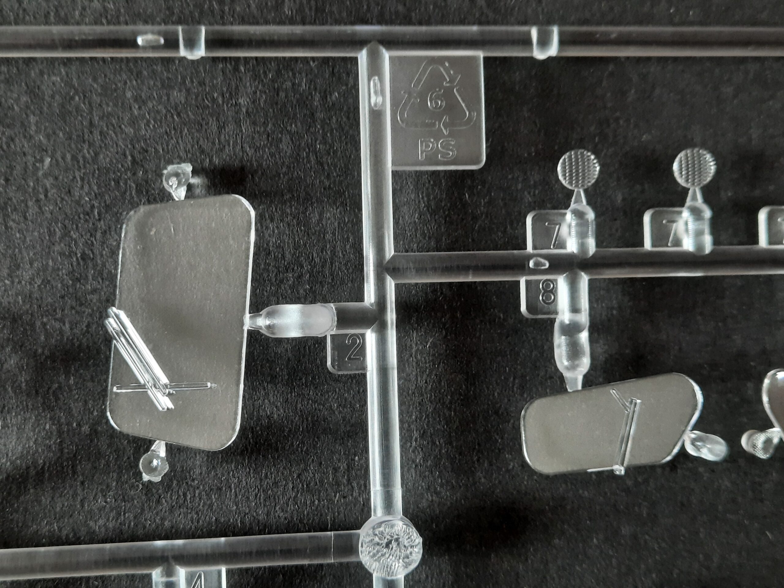 Die Klarsichtteile sind ohne Schlieren und dienen der Kabinenverglasung und der Beleuchtungseinrichtung des Fahrzeuges. Kleiner Kritikpunkt hier die aufgeprägten Scheibenwischer auf der Verglasung. Separate Scheibenwischer würden ungemein das Lackieren erleichtern und würden zusätzlich für eine größere Detailtreue und Wertigkeit sorgen.